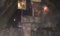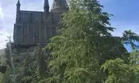 The castle features two attractions: Harry Potter and the Forbidden Journey and the Hippogriff's Flight roller coaster. Performances include the Frog Choir, a Triwizard Tournament performance, and a castle night light show during certain periods. Other attractions include the Three Broomsticks pub and Ollivander's Wand Shop.