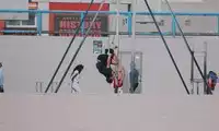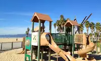Venice Beach, while it bears the name "Venice," is actually a Los Angeles locale. The name originated from a network of canals dug into the area of the city adjacent to the beach, earning it the nickname "Venice," much like Suzhou being called the Venice of the East. Venice Beach is perhaps the most secular part of Los Angeles. Unlike Santa Monica Beach, which is packed with international tourists, or Malibu, where it's more upscale, it's a vibrant place for all walks of life. You'll find vendors selling all sorts of unique goods, street performers, street basketball, roller skating, skateboarding, cycling, beach volleyball, and other sports, as well as graffiti and hip-hop artists. It's a bustling scene. This is probably the most crowded beach in Los Angeles. Every available parking spot is filled, and people are imaginatively squeezing in where no parking is clearly marked. I wasn't so adept at that, so I found a paid parking lot a little further away. If you go after 4 p.m., you can find a spot in the beachfront parking lot, and the rates are discounted. We arrived in the afternoon, the sun still high, and the beach was too hot. We first wandered around the street market and the street performances, but we couldn't handle the hustle and bustle anymore. We'd been terrified back home of the crowds, and we were so tired of them. We went abroad for the quiet, so we took one look and left. The beach was huge, with a section designated for children. Tuanzi took a fancy to the swings and swung on them for a long time. There's a small park near our apartment, and the standard park amenities are a sand pit, a slide, and swings. Tuanzi, without any instruction, learned to swing on his own after dozens of attempts. He often says, "Look, Dad, I can swing so high!"