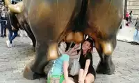 The Wall Street Bull is said to bring good fortune, but you have to touch its balls to get it (covering your face)