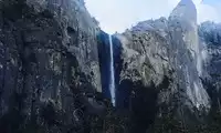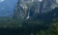 At the confluence of CA-120, CA-49, and CA-41 lie Valley View and Tunnel View, both ideal vantage points for viewing the U-shaped valley. The U-shaped valley is covered in cobwebs, with Half Moon Butte in the distance serving as the valley's most striking feature. The view from here is relatively expansive within the valley. On clear days, at midday, the sun beats down on the granite cliffs of Half Moon Butte, highlighting its dramatic and imposing presence. In the evening, the setting sun paints Half Moon Butte an orange-red, resembling a blazing fire. When the sky is overcast, the dark clouds, juxtaposed against the inky blackness of Half Moon Butte, create a sense of depth. When the rain clears, rays of sunlight pierce through the gaps in the clouds, shifting as the clouds dissipate, creating a natural laser show. After walking a short distance, we heard the rumbling sound of water and saw Bridalveil Falls on our right. This small waterfall, hazy and shimmering, resembles a bridal veil suspended in the air. During the Ice Age, Yosemite's main valley contained a large amount of ice, creating a deeper valley. The tributaries flowing into the main valley contained less ice, creating shallower valleys. After the Ice Age ended, these tributaries became like hanging valleys. As the rivers reached the end of these valleys and prepared to merge with the main valley, they cascaded down one waterfall after another. Bridalveil Falls is one of the many waterfalls flowing from these hanging valleys, and it's the first one we'll see along the way.