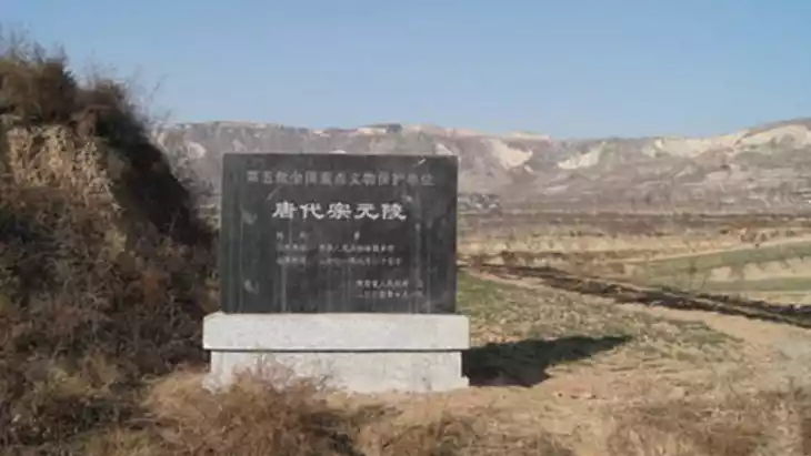 The Tang Dingling Mausoleum is located on Phoenix Mountain. The mountain is composed of three ridges connected from east to west. The central, southern ridge is prominent, with dark blue stone resembling a bird of prey in flight, hence the name Phoenix Mountain. A stone cave was carved into the central ridge to form the tomb, and various stone statues were carved into the stone, following the tradition of the Qianling Mausoleum. Originally, there were over 50 stone carvings, but due to war and theft of stone chiseling tools by nearby residents, the mausoleum grounds and the four gate stone carvings were almost completely looted.