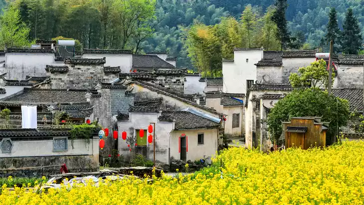 March to May: In spring, rape flowers bloom in the ancient Huizhou area. The golden flowers set off the ancient village, and the pink and white flowers of peach blossoms and pear blossoms are interspersed, creating a bright and beautiful spring scene.