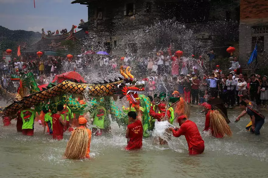 Tasha Village, located in the western part of Shuyang Town, Nanjing County, is a renowned overseas Chinese hometown in Zhangzhou and one of the first 15 designated scenic villages in China. Known as the "Zhouzhuang of Southern Fujian," its tulou (earthen buildings) are evenly distributed along the riverbank. They come in a variety of shapes, including the familiar square and circular, apron-shaped, and L-shaped. Most unique are the single-courtyard, earthenware, and brick-and-wood structures reminiscent of the Zhejiang and Hangzhou water villages, creating a fascinating landscape of large buildings interspersed with smaller ones, with varying heights. Its unique shape and style have earned it the nickname "Tasha Village's mythical mountain architecture from a bird's eye view." Local Fujian photographers have combined the tulou with dragon and lion dances to create captivating images of the region.