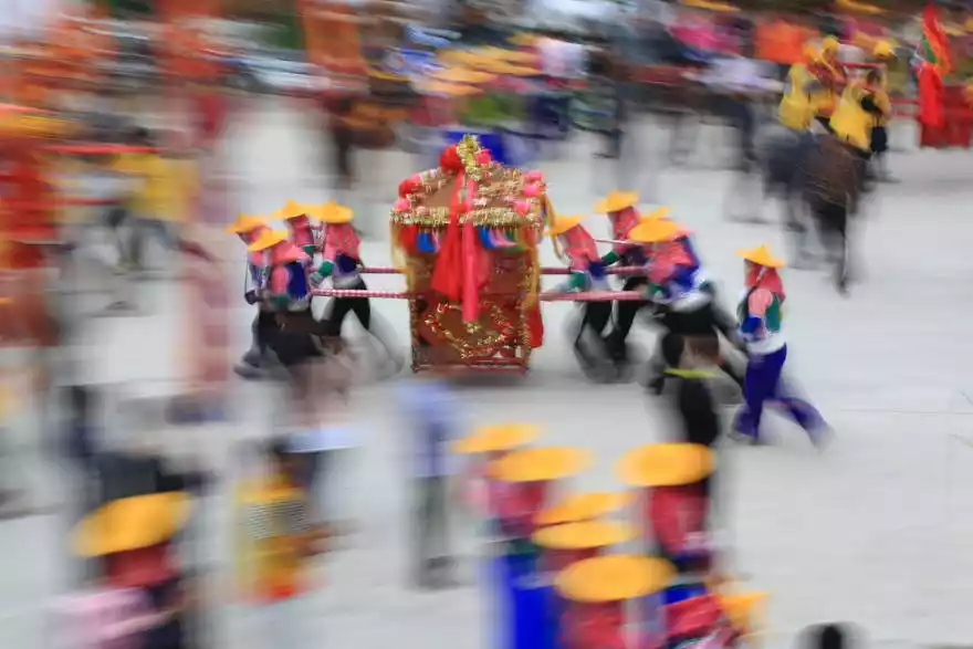 Besides plum blossom season, Meilin also celebrates another important festival: the birthday of Mazu. Meilin Village, located in a remote mountainous area of Nanjing County, is home to a large Taiwanese community. Legend has it that in ancient times, many locals traveled across the sea to Taiwan and Southeast Asia to seek a living. Those left behind would "invite" Mazu, revered by coastal fishermen, back to their hometowns and build a Tianhou Temple to enshrine her, hoping to bless their loved ones abroad and express their longing for her. Consequently, local folk activities have been held around Mazu's birthday for over 300 years. This is why, despite Meilin Village not being near the sea, Mazu is still worshipped there. During this time, photographers from around the world flock to capture this important custom. For photography enthusiasts, don't miss this opportunity!
