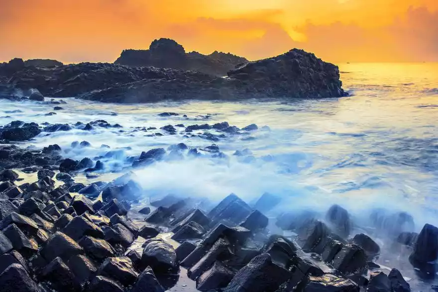 The Baitangwan volcanic rock formations, also known as the Longjiao Ancient Crater in the National Geopark, are shaped like a trumpet-shaped opening, with a diameter of approximately 50 meters at the top and a depth of 3 meters at the bottom. At high tide, the sea submerges the bottom, and the entire crater is only visible at low tide. The volcano has experienced 15 eruptions, and the eruption materials visible today are approximately 24.6 million years old. Its eruption mechanism is complete, its layers are clearly defined, and the crater is well-preserved, earning it the nickname "a rare ancient volcano museum" and "Terracotta Army" by geologists. Photographing the Baitangwan hexagonal volcanic rock formations requires careful timing, especially for capturing the sunrise and sunset slow-motion photography. The three days before and after the first and sixteenth day of each lunar month are the best times to view and photograph the volcanic rock formations. At this time, the sunrise and the hexagonal prisms create a seamless image, a favorite moment for landscape photographers. Be sure to check the dates carefully if you're planning a visit!