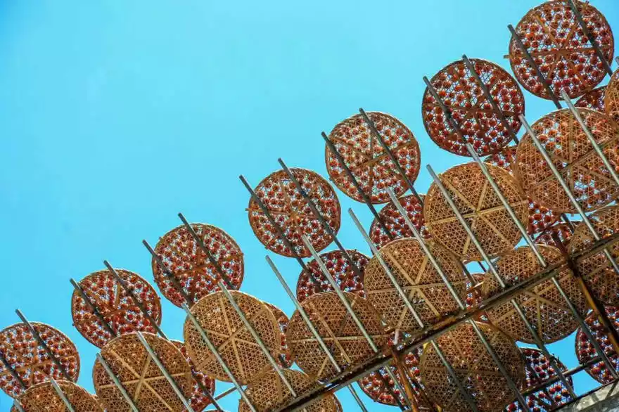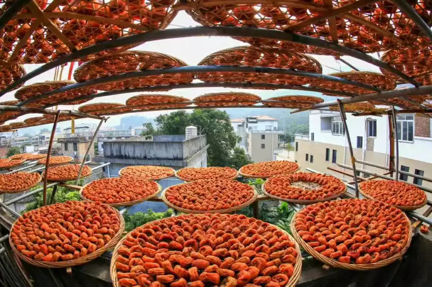 With the arrival of autumn, the drying of persimmons in the sun in Huangling, Wuyuan, becomes a popular destination for photography. However, in Quanzhou, Fujian, there's a destination comparable to Huangling: the persimmon-drying scene at Quanzhou Persimmon Village. During persimmon harvest season, the rooftop courtyards of Quanzhou Persimmon Village are filled with persimmons drying. As the persimmon hometown of Quanzhou, this time of year is a prime draw for photography enthusiasts! Bamboo sieves woven with bamboo strips, filled with crimson persimmons, set against a blue sky, create a festive and joyful scene of harvest and drying!