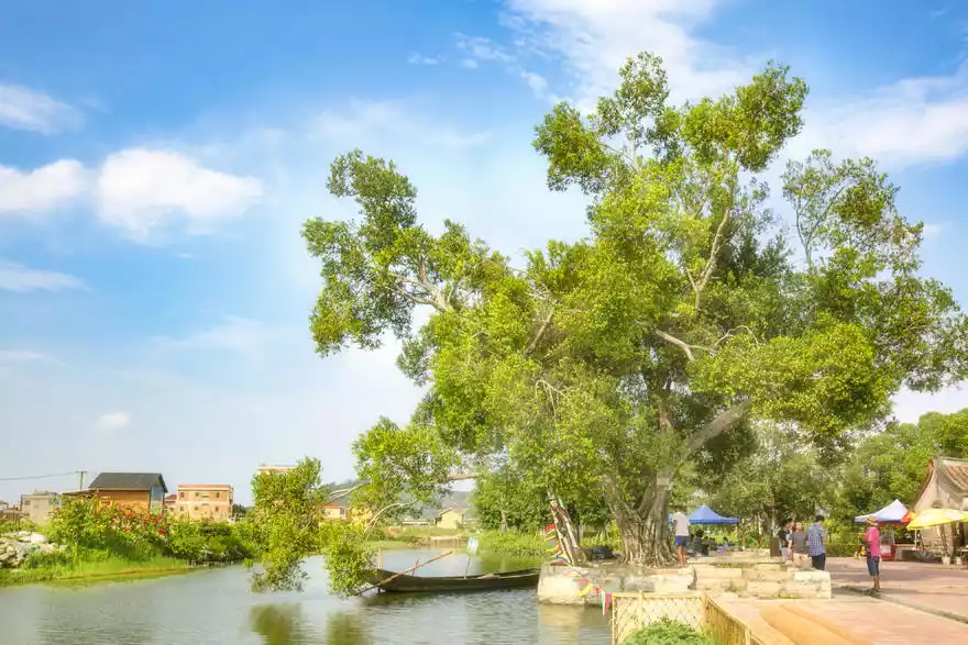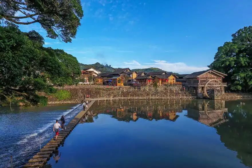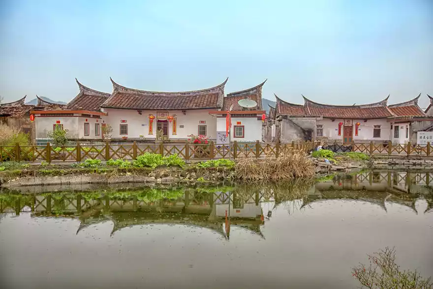 Most ancestral houses are typical Southern Fujian courtyard houses (two courtyards and four bays), constructed with wooden frames and woven bamboo walls covered in paper ash. An inland river winds around the village like a long jade belt. From the air, the entire village appears to float above the river, creating a unique landscape of "green water surrounding the village and jade belt encircling the community." This makes Daimei a veritable "Zhouzhuang of Southern Fujian".