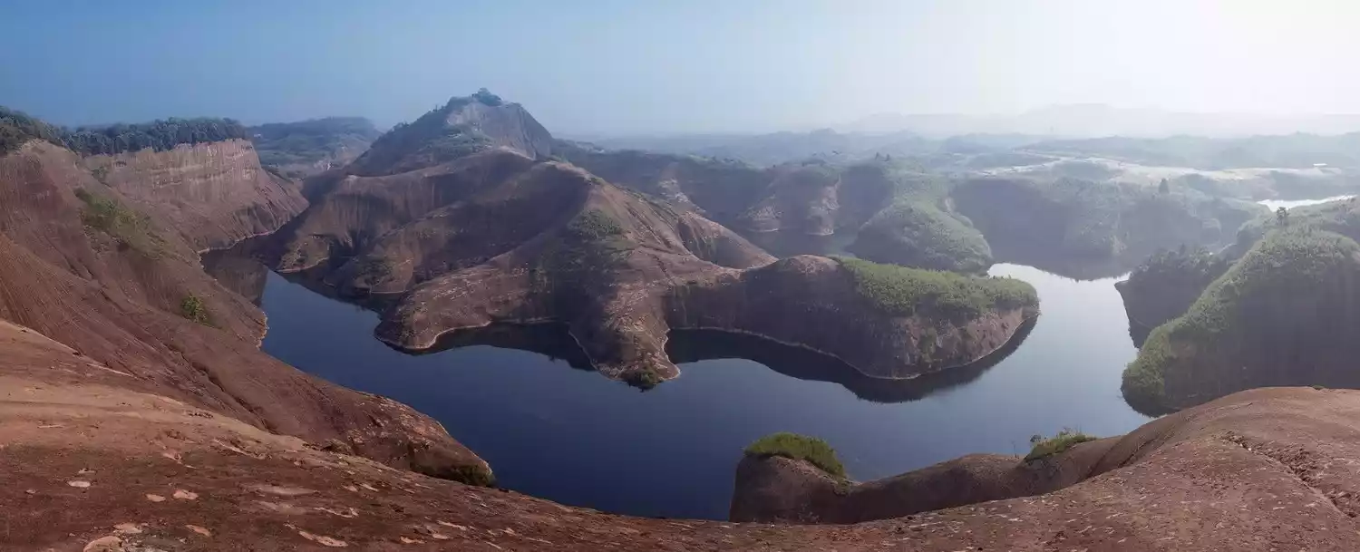Gaoyiling belongs to Danxia landform. Different from many other Danxia landforms, Gaoyiling has more soft curves. One of the unique wonders of Gaoyiling is the Giant Lizard Mountain in the picture, which looks like a giant lizard circling and wagging its tail playing in the lake, vivid and lifelike.