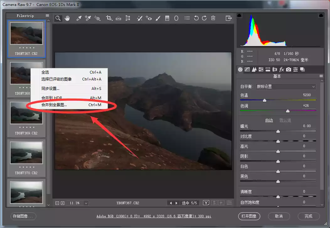 3. Press Ctrl+left key to select all photos, right-click and select "Merge into Panorama", and wait for the software to automatically align and stitch