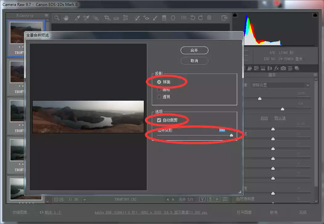 4. After the software automatically stitches, the "Panorama Merge Preview" window will pop up. Select "Spherical", "Auto Crop", and drag the border deformation (by slightly deforming the border pixels to include more pixels, reducing unnecessary cropping and wasting pixels. This function is mostly used for natural scenery. Use it with caution on photos with buildings or people to avoid causing distortion that is inconsistent with reality) to the appropriate parameters and press "Merge".