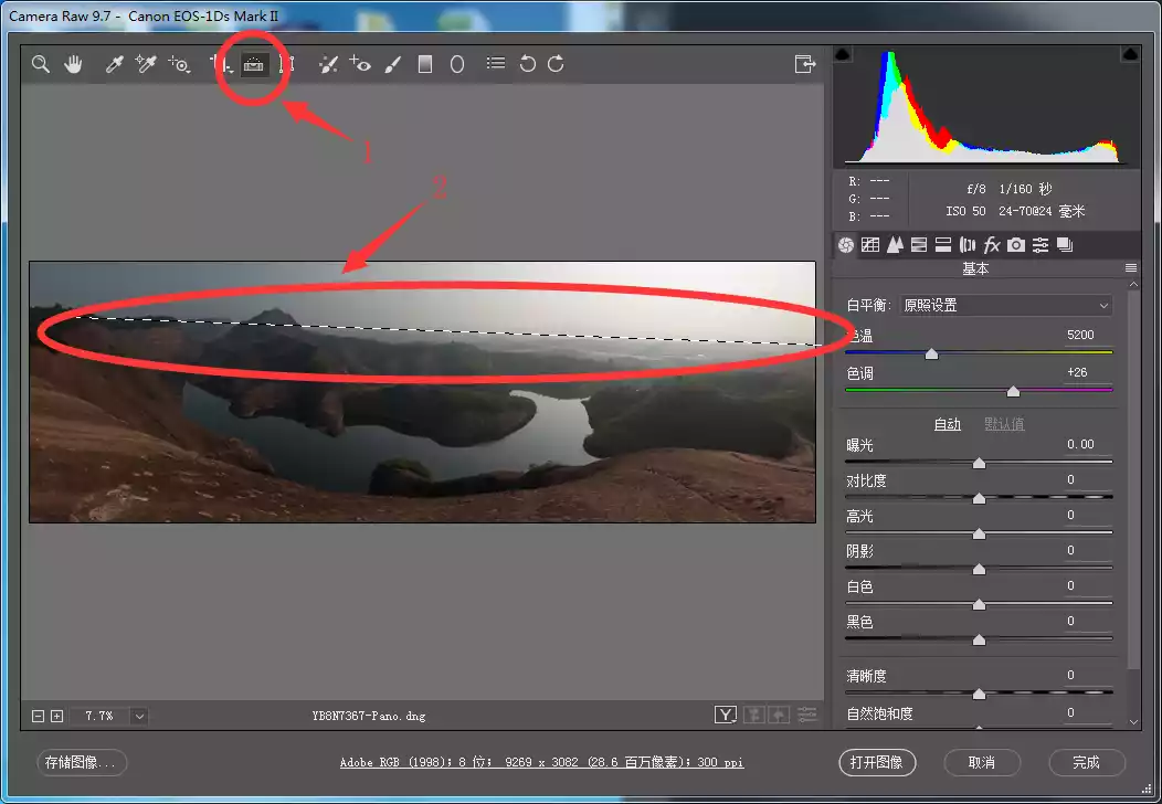 6. The stitched panorama often has the problem of uneven horizontal lines (because the stitched pieces are too long and it is difficult to ensure that each photo is strictly horizontal). We can use the straightening tool as shown in the figure to draw a straight line where it should be horizontal (the place where it should be horizontal in this picture is the skyline). Press Enter to confirm. The panorama will be automatically horizontalized and cropped.