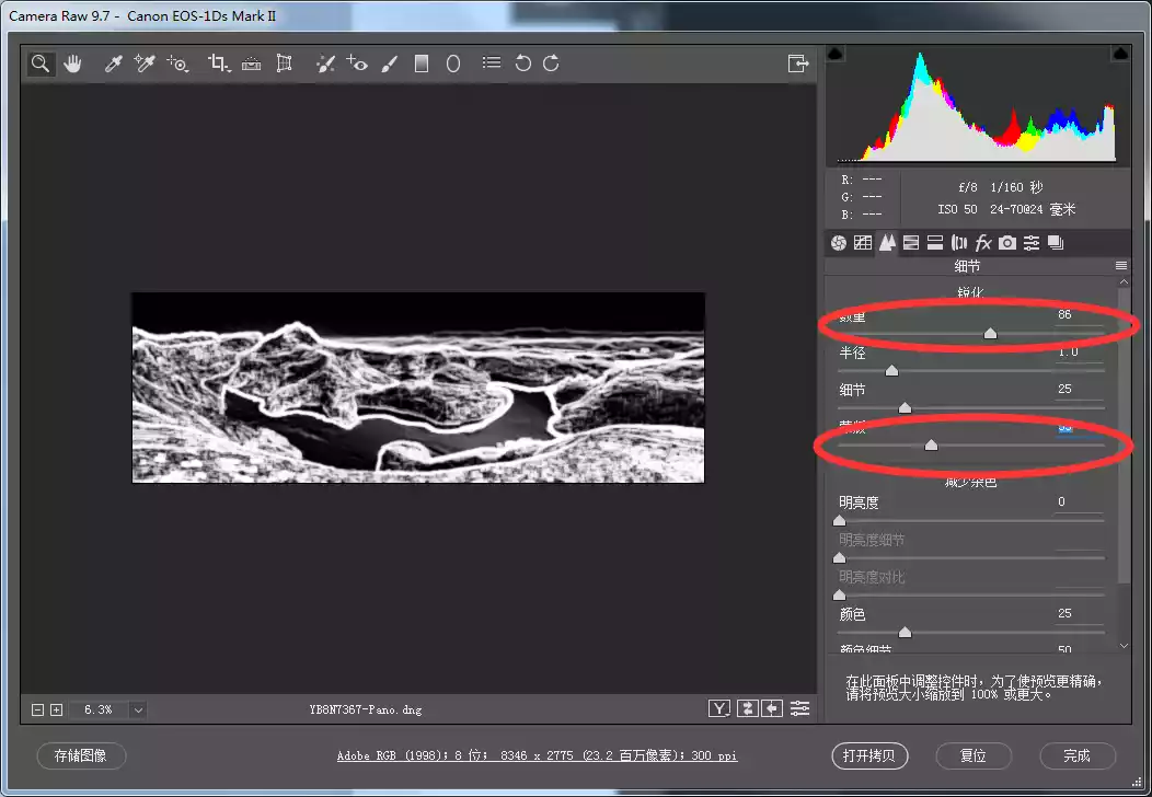 10. Sharpen and reduce noise in the "Detail" column (hold down Alt and drag the "Mask" bar in the Sharpen column to observe the white outline (the sharpening area is a reminder). Only sharpen the edges that need sharpening. The "Reduce Noise" column can be left unchanged because there is no obvious noise in this image)