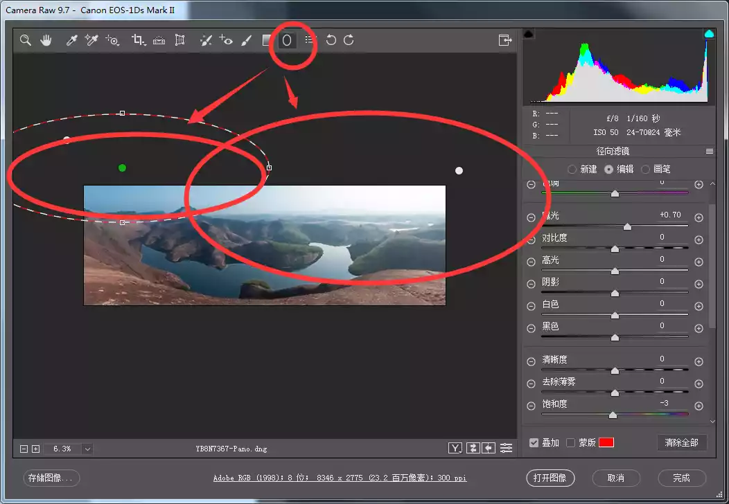 13. Use the "Radial Filter" to adjust the brightness and saturation of the sky area as shown in the figure, and balance the sky saturation and light ratio. At this step, we can press "Open Image" in the lower right corner to export and save it in PS.
