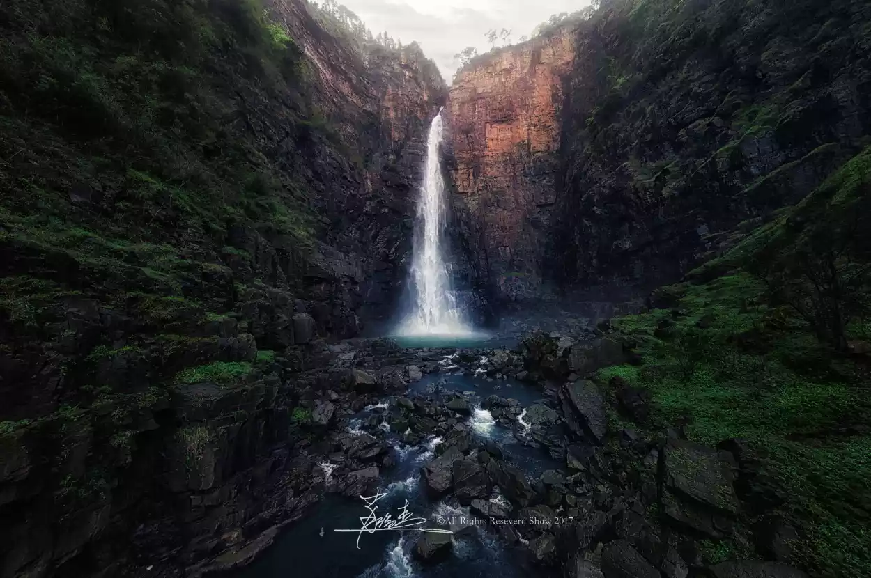 Let's look at another panoramic photo in the canyon. Because I was very close to the waterfall and the cliffs on both sides were very narrow, I still used vertical format to shoot multiple photos and then stitch them together. This broke through the limitations of location and lens, while enhancing the perspective and grandeur of the picture.