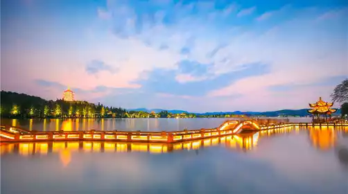 Just down from Baoshishan Mountain is the Broken Bridge, and not far away is the Children's Palace Pier. On summer evenings, embark on a night cruise on West Lake. The boat is the "Baoshifang" used for the G20 summit, and the lake is a cool, breezy night. The scenery is the nightscape of the Broken Bridge, Lei Feng Pagoda, and the Three Pools Mirroring the Moon.