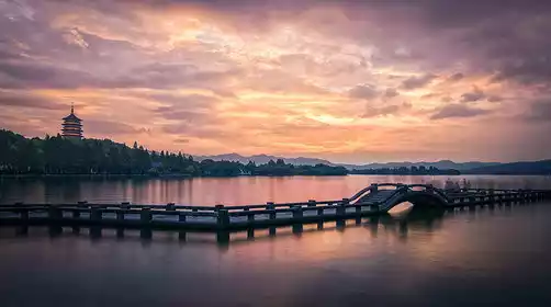 The park captures two of the ten West Lake scenic spots: Leifeng Pagoda Sunset and Nanping Pagoda Evening Bell. Just east of the park is Changqiao Park, known for its "not-so-long bridge." This is the scene of the eighteen-mile farewell in the film "Butterfly Lovers," and a classic camera spot for capturing the sunset over Changqiao and Leifeng Pagoda.