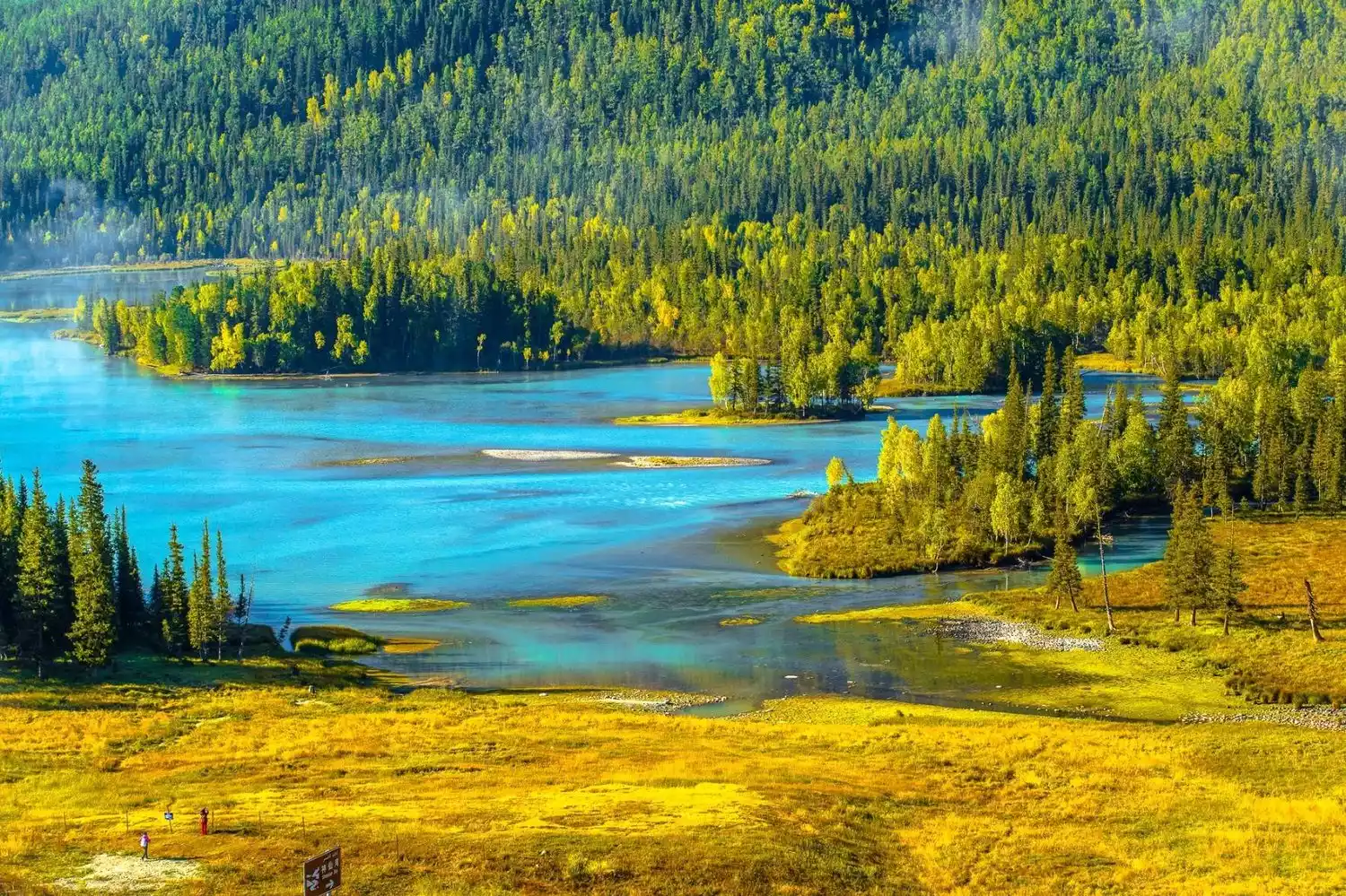 At its widest point (700 meters), the Kanas River flows gently, with large swamps and grasslands. There are small islands scattered in the river, which are a combination of spruce and larch. Under the sunlight, the lake surface is scattered with fine light, and with the perennial clouds and mist, it is like a fairyland.