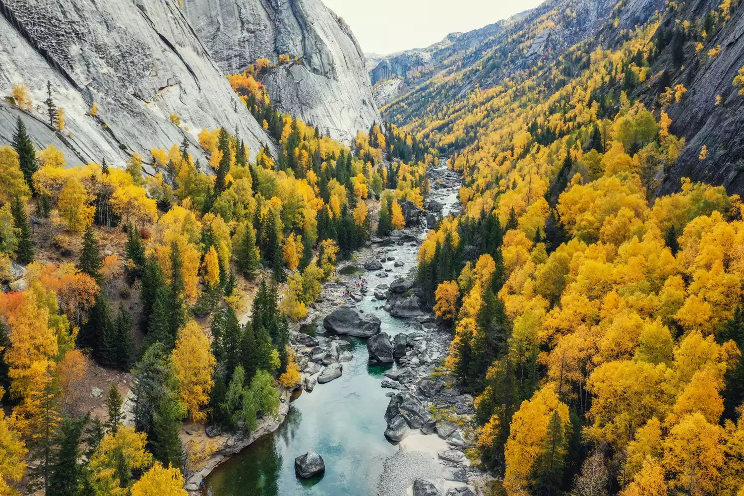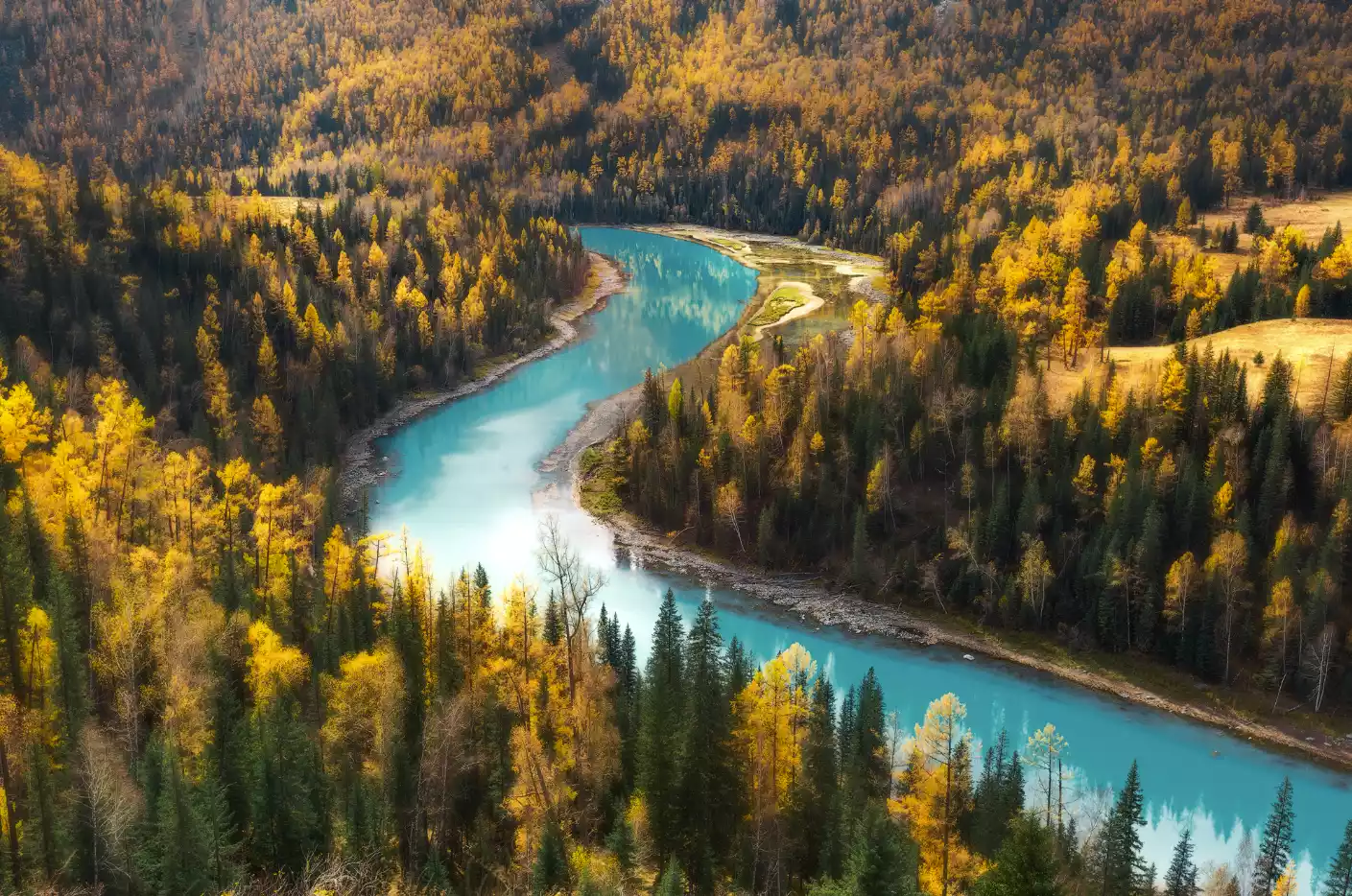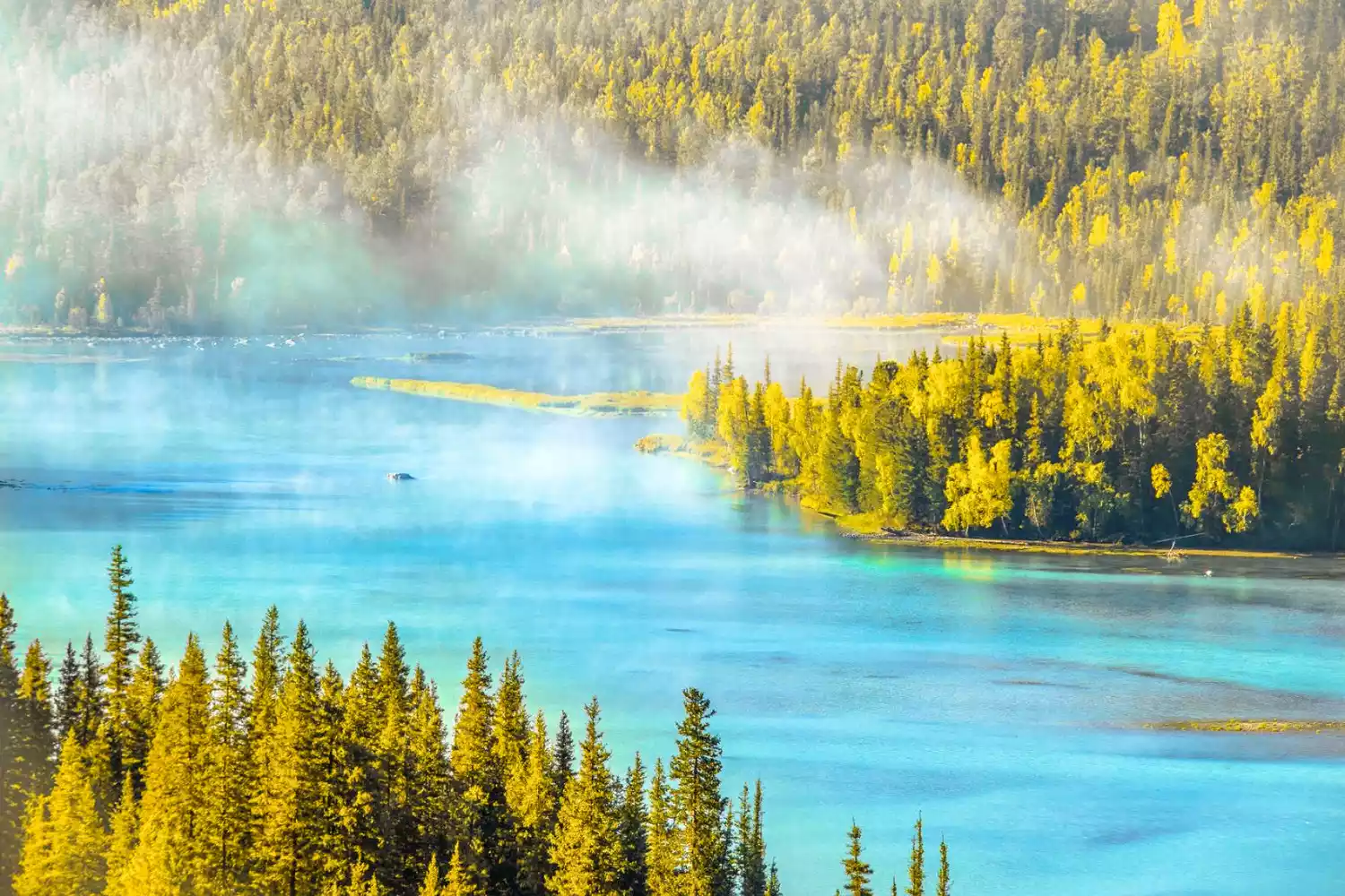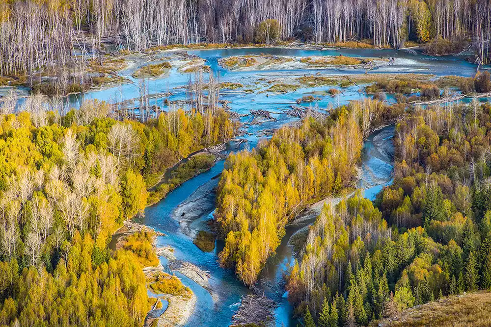 September brings the first sign of autumn to the higher latitudes of Kanas Prefecture in northern Xinjiang. This region is also known for its most iconic autumn colors. Every autumn, golden birch, apricot-yellow larch, fiery red European poplar, and evergreen pine and cypress create a vibrant feast that puts any Impressionist painting to shame.