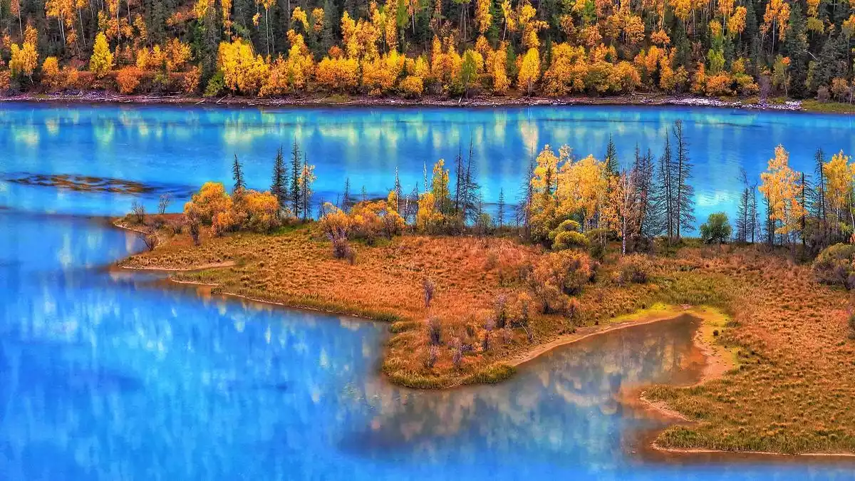 Here, the rivers crisscross, with a central beach in the middle that resembles a dragon sleeping in the blue Kanas River. In autumn, the island's foliage is a vibrant, vibrant color, seemingly covered in auspicious clouds. Let your imagination run wild when you see it.