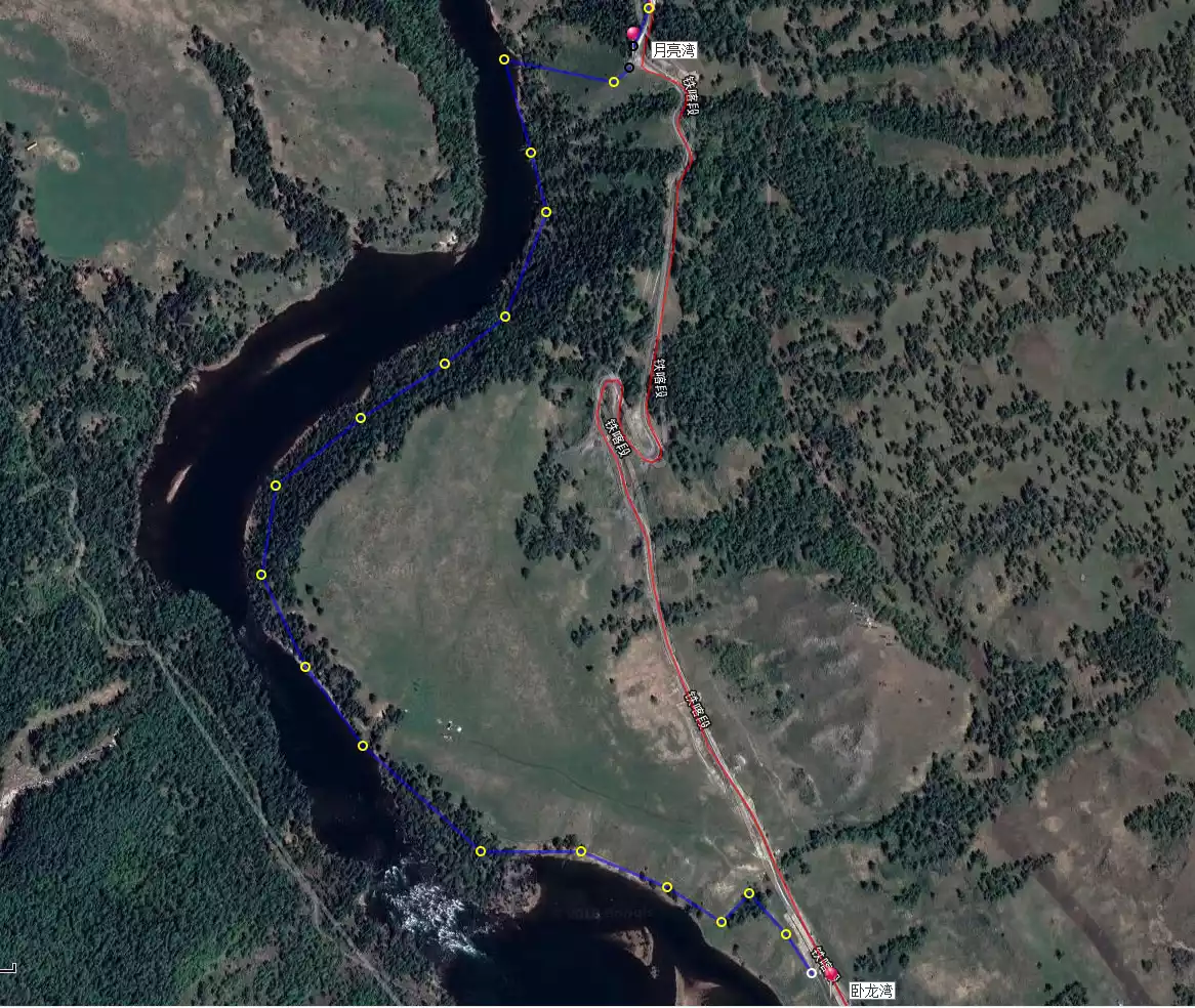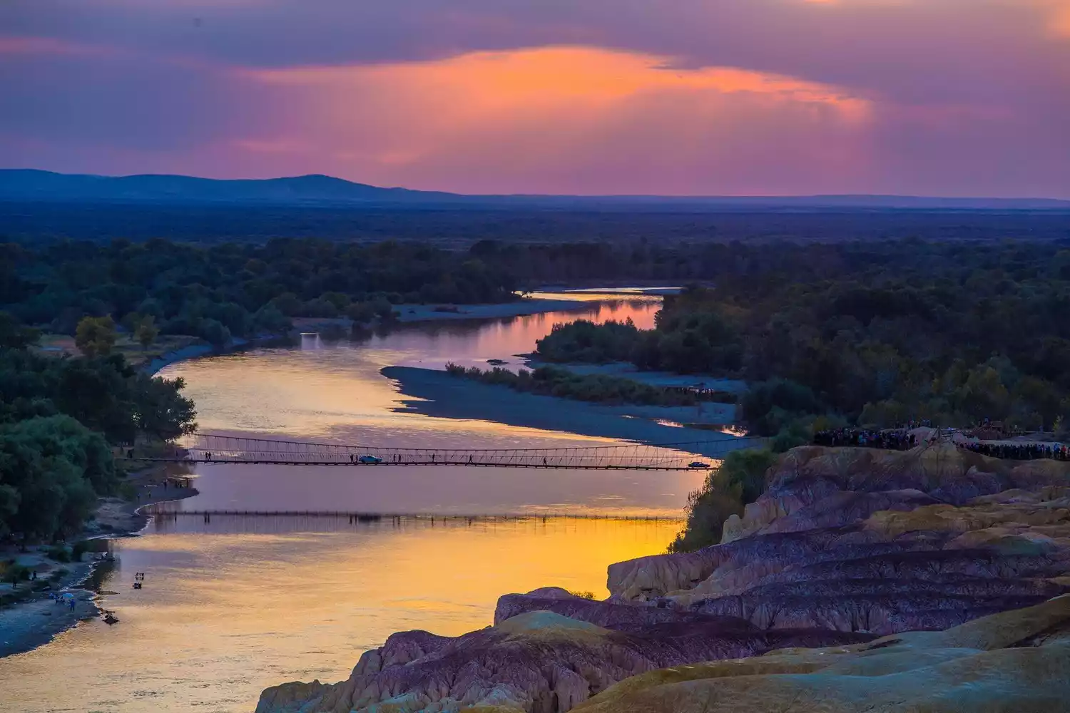 The river bend here is like an "S"-shaped bend, like a crescent moon falling into the valley. On the shallows in the north of the river bend, there are two footprint-shaped grass beaches, which are known as "Genghis Khan's Footprints".