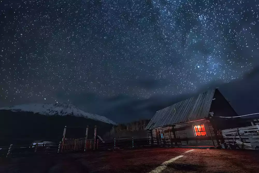 3. A good foreground, snow-capped mountains, wooden houses, and beautifully shaped trees can all be used as a starry sky foreground.