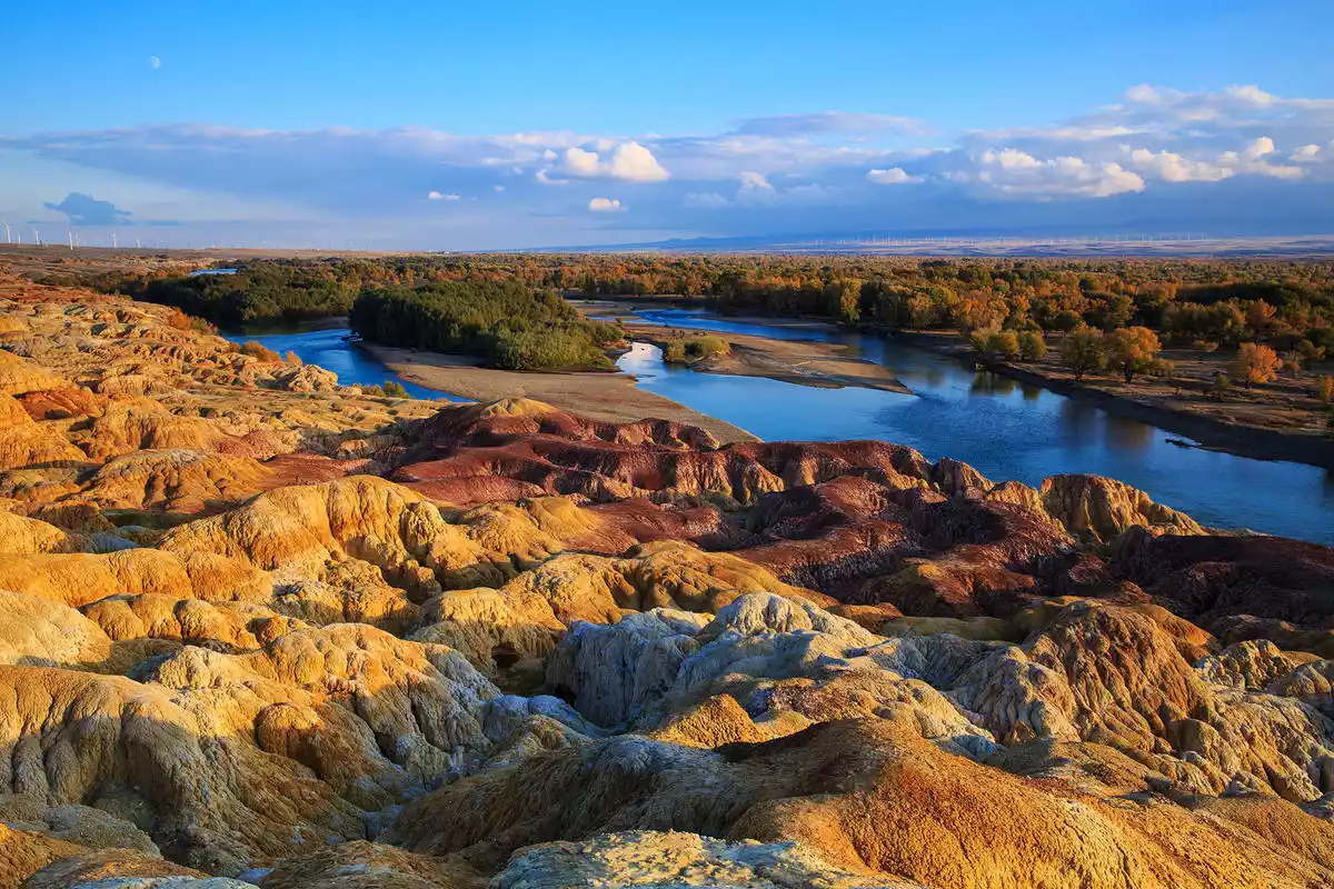The Irtysh River, China's only river flowing from east to west to the Arctic Ocean, flows through the Five-Colored Beach, one of the most beautiful Danxia landforms in the Altay region. A unique example of Linshui Danxia, the beach boasts vibrant colors beneath the water, lush vegetation on the opposite bank, and the Irtysh River flowing through it. Windmills can be seen in the distance, and the perfect pre-sunset light adds a vibrant touch to the landscape.