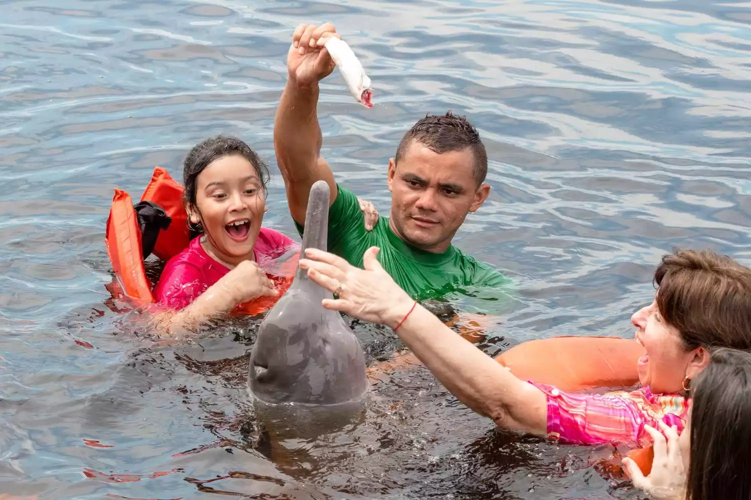 Swimming with dolphins: Yes, you read that right. There are dolphins in the Amazon River. Their mouths are long and pointed, a little different from what we see in the sea. There are also pink dolphins in the Amazon River. You can also go in the water and play with wild dolphins.
