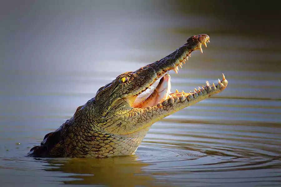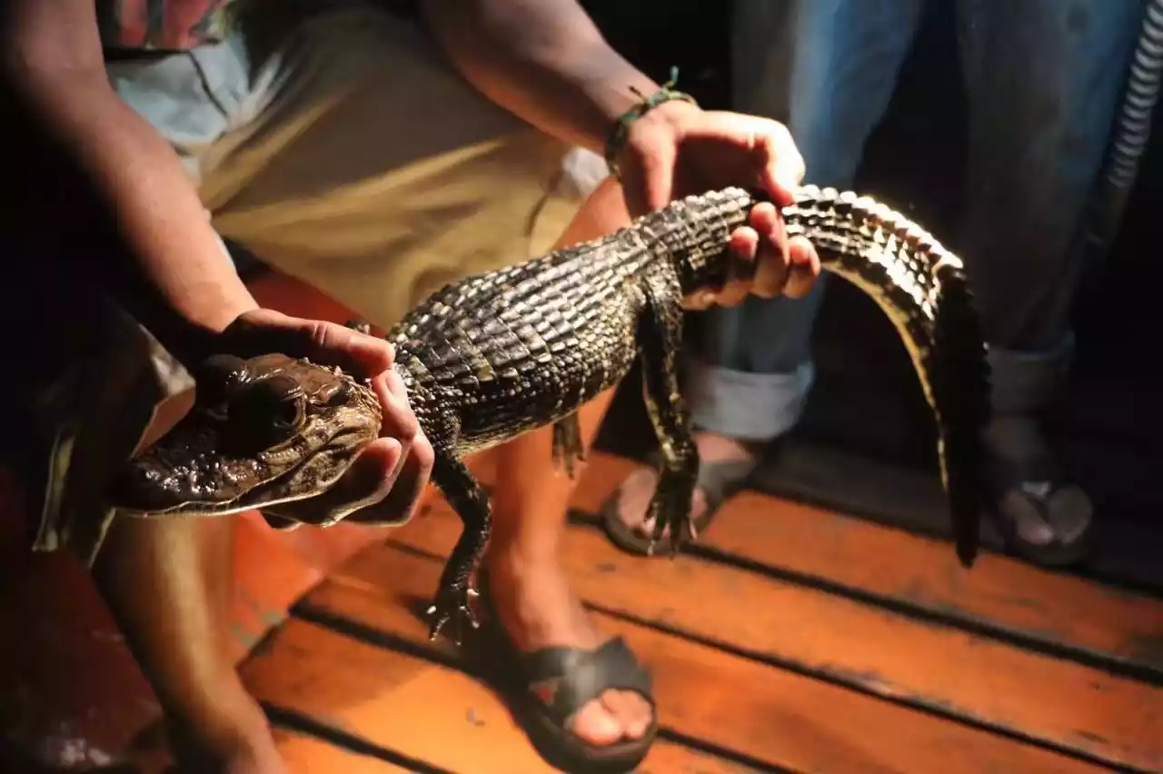 Crocodile hunting is a nighttime activity, conducted in complete darkness. A guide, armed only with a headlamp, leads a boatload of people through the river. The guide locates crocodiles by shining the light of their headlamp into their eyes. Large crocodiles are known to be aggressive, so they capture smaller ones for closer inspection.