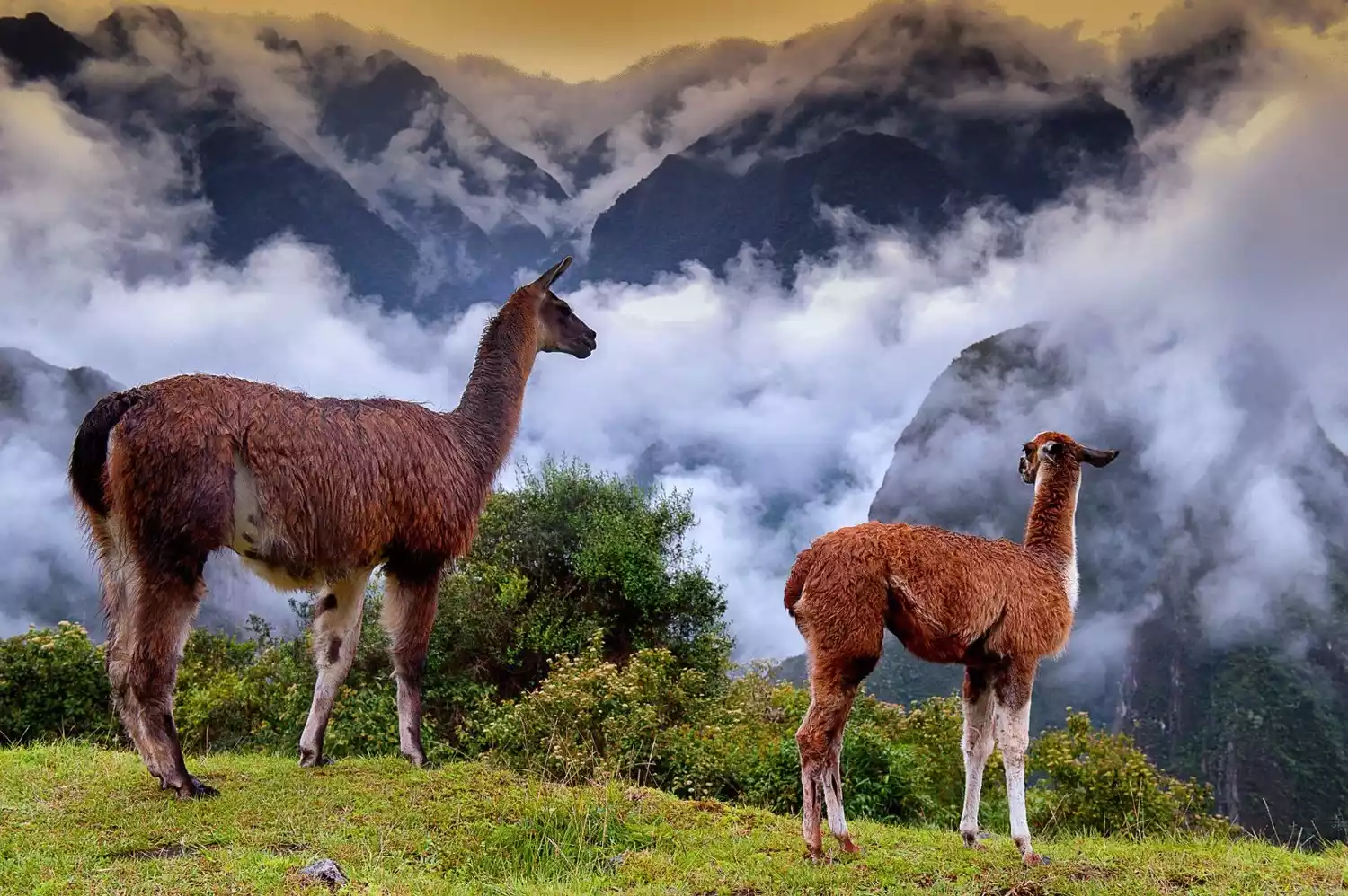 Enter the scenic area and ascend directly to the Funeral Stone Guardian Shed to admire a breathtaking view. As the first rays of morning light descend, Machu Picchu gradually emerges from the thick fog surrounding the mountains. The Inca sun god bestows golden sunlight upon the ancient city, and the entire city's outline becomes clear.