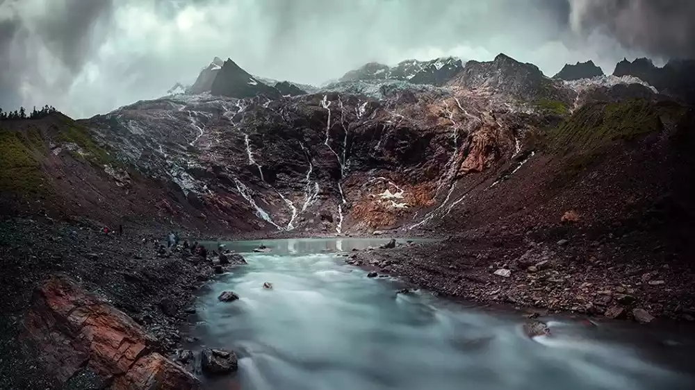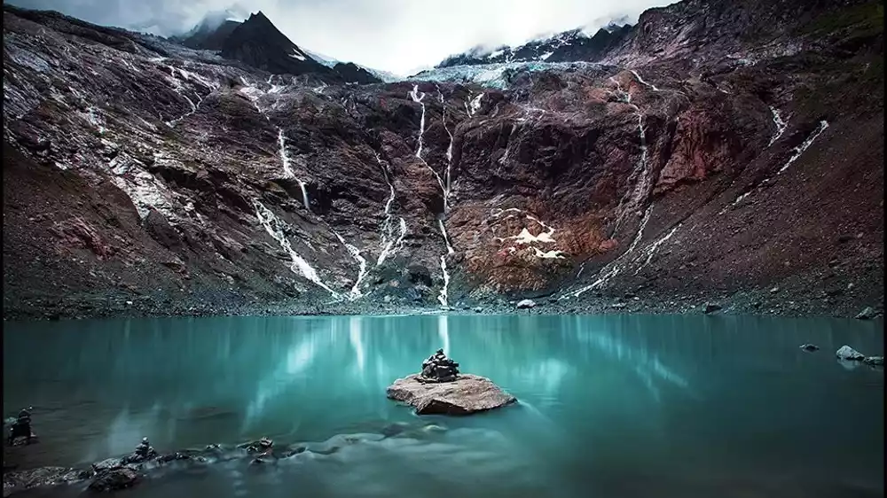 The glacial lake is a typical ice-stained lake, formed by glacial movement eroding the surface. The dark blue glacier and the emerald green lake water complement each other.