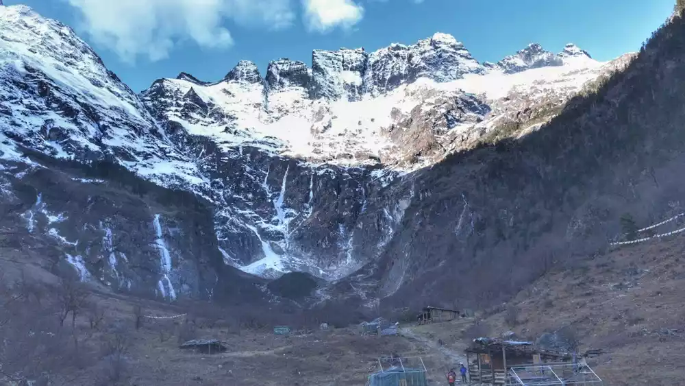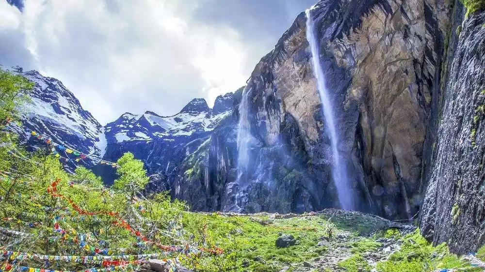 The Divine Waterfall, formed by the cascading meltwater from the snow-capped mountains, offers a panoramic view of the Five Crowns Peak. The Divine Waterfall beneath the snowy mountains is where pilgrims receive baptism and is the heart of the pilgrimage. Only after being baptized in the divine waters can the pilgrimage be considered complete, cleansing both the mind and body. After circumambulating the Divine Waterfall, return to Yubeng Village to rest.