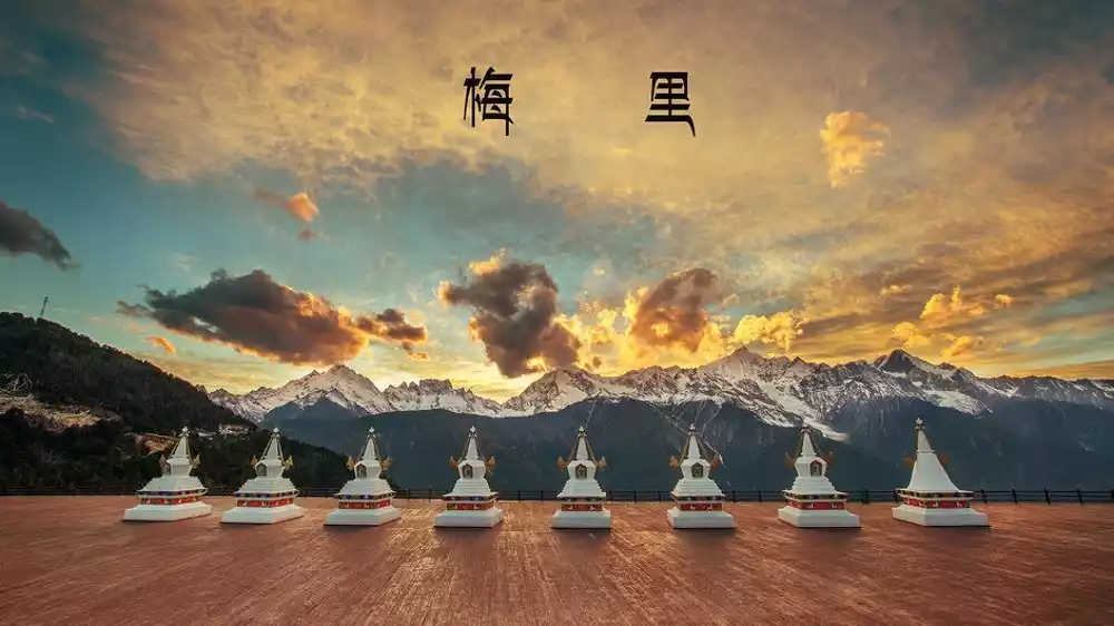 Get up early and go to the Pearl Laka Observation Deck to watch the [Sunset over the Meili Snow Mountain] and pray devoutly to the sacred mountain Kawagebo.