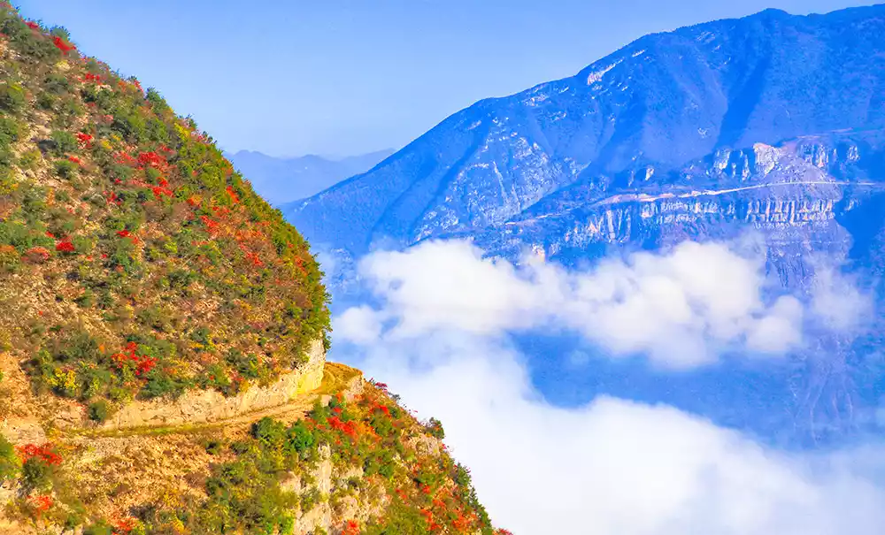 To enjoy the red leaves in Qutang Gorge, you can start from Baidi City and go directly to the top of the Three Gorges - Zhengkuimen, which is the section with the most red leaves in Qutang Gorge.