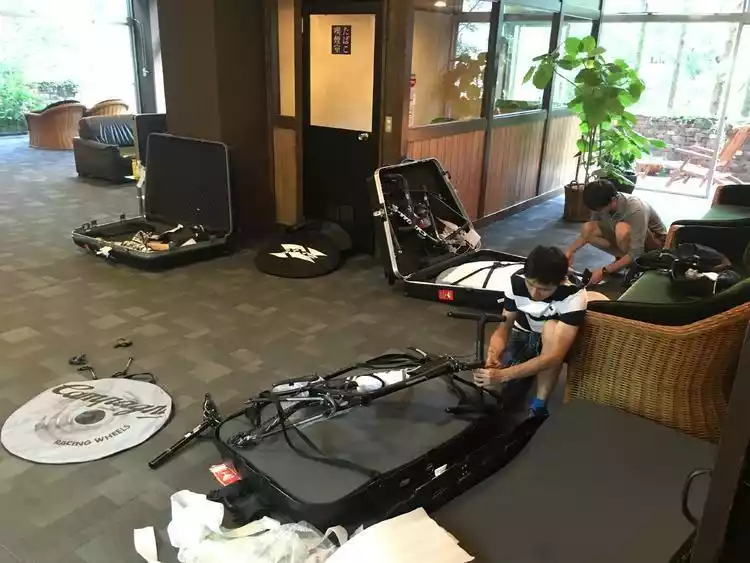 After dinner, we had an important task: loading the bike. With the hotel staff's approval, we began loading the bike in the hotel lounge, minimizing the impact on other guests. As we did so, curious guests kept approaching us, and upon learning we'd come all the way from China to bike up Mount Fuji, they expressed their admiration.