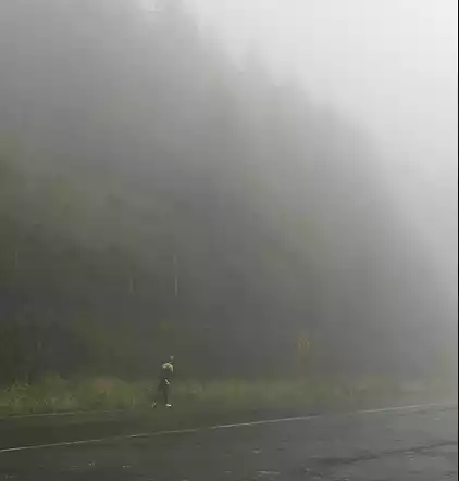 By the time I reached the second station, the weather had begun to change: fog thickened, the temperature gradually dropped, and visibility began to decrease. I occasionally encountered fellow Japanese cyclists, who greeted me warmly. By the time I reached the third station, a light rain had begun, forcing me to stop and change into fleece-lined cycling clothes. The damp and cold weather was a real test of my stamina. I ate my supplies while pedaling hard, barely able to even snap a photo.