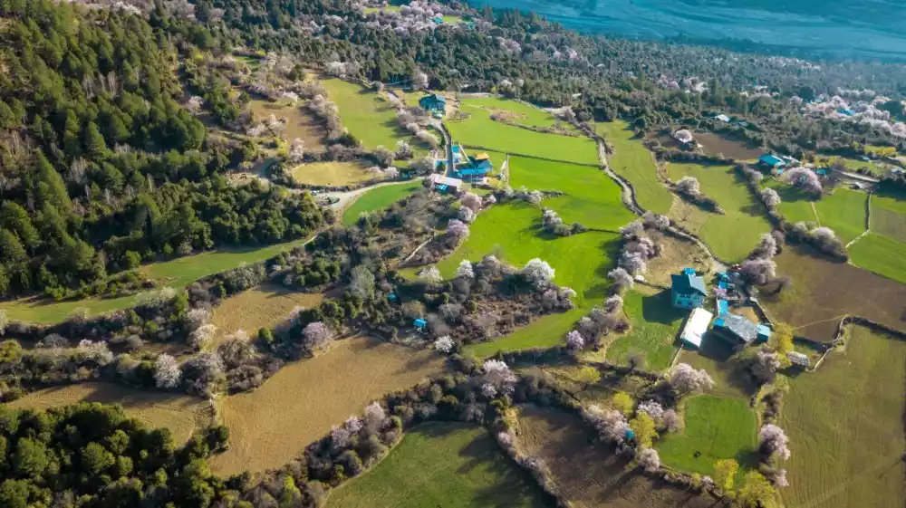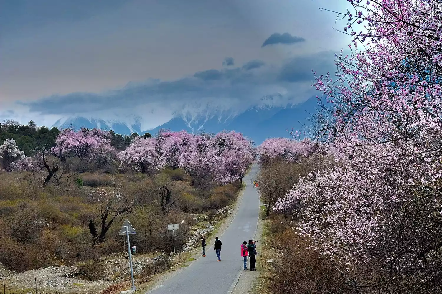 About 10 kilometers out of Bomi County on National Highway 318 lies a place called Taohuagou. A sudden turn from 318 leads you deeper along a narrow road, from Runa Village to Qingduo Town and on to Yuxu Township. Peach trees line the road for dozens of kilometers. Looking down, the green barley fields are divided by peach trees, and the road stretches through the village into the distance. The further you go, the more ancient peach trees you see, some reaching a meter in diameter. These peach trees here are not planted but wild. For centuries, the Tibetan people have never destroyed or cut them down, a testament to their deep appreciation for all living things. Strolling amidst the beauty of peach blossoms, breathing in the natural aroma of the earth and the fragrance of the blossoms, you truly feel like you've stumbled into a paradise.