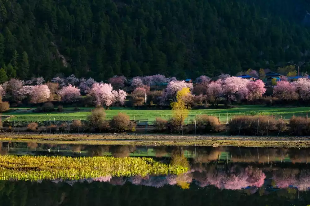 Garang Lake is located southwest of Bomi, near the entrance to Taohuagou. Continuing westward along Taohuagou, after crossing the Bode Zangbu Bridge and heading north a short distance, you'll enter the Garang Lake Scenic Area. The beauty of the peach blossoms at Garang Lake is beyond words; being there truly captivates! It's a truly idyllic landscape: lush green grass beneath a blue sky, peach blossoms in full bloom amidst snow-capped mountains. Verdant wheat seedlings and brown-red soil create a tranquil and leisurely scene of farming. Garang Lake isn't large, with Garang Village nearby. However, its tranquil surface beautifully reflects the snow-capped mountains, the village, and the peach blossoms, making it a favorite spot for photographers.