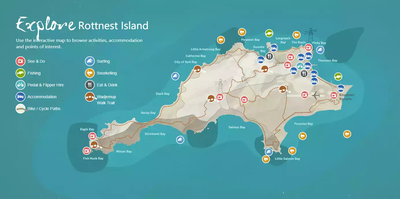 Most people arrive by boat from Perth's Northport or B-shed Wharf. Once on the island, you can choose to hop on and off the island bus, or rent a mountain bike for an off-road tour. Cycling the entire island can take four to five hours and requires considerable stamina, so many people choose to cycle to their destinations rather than actually circumnavigate the island.