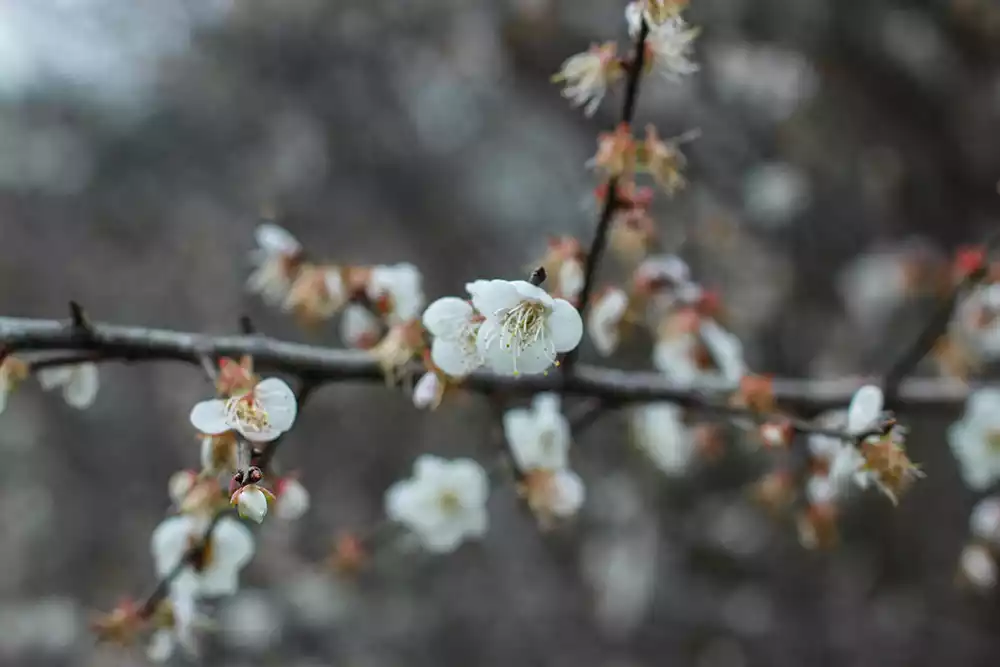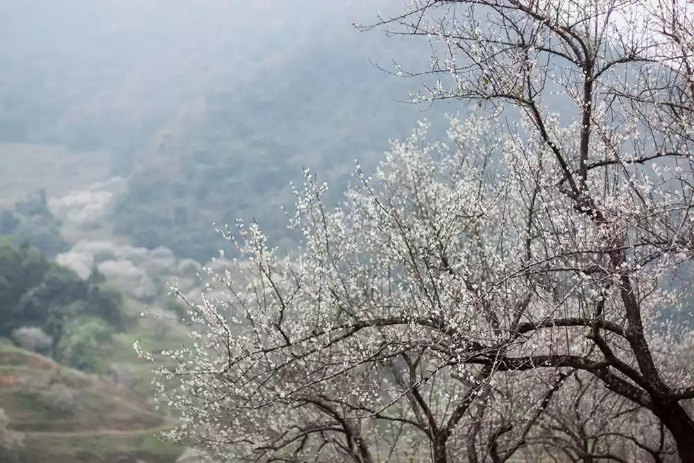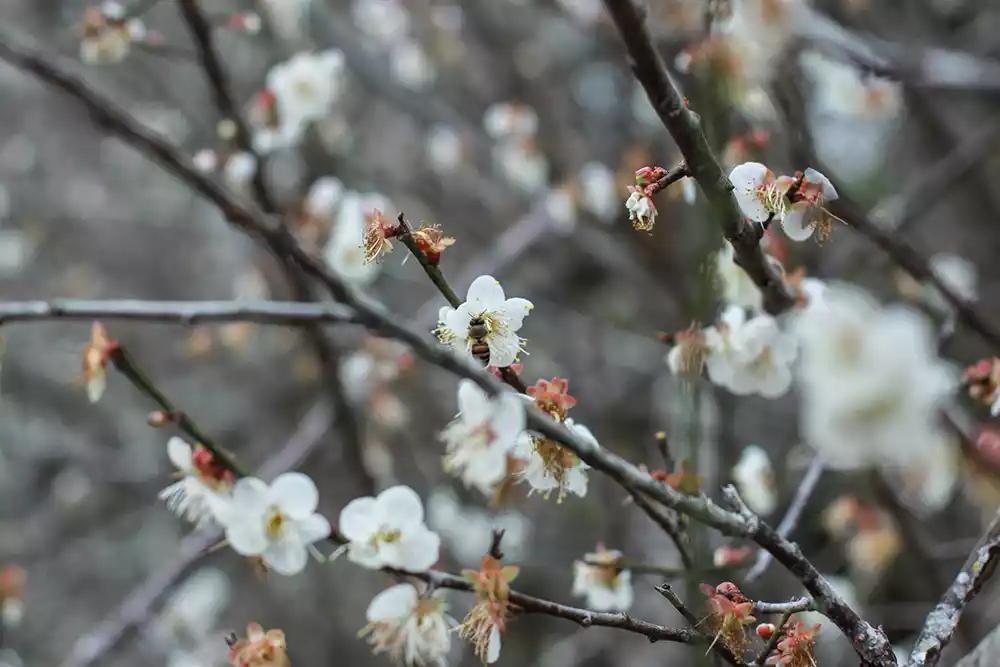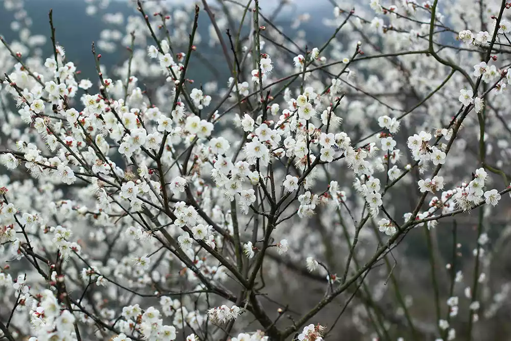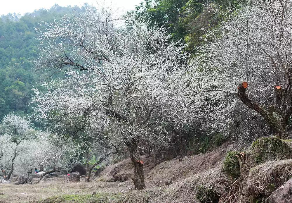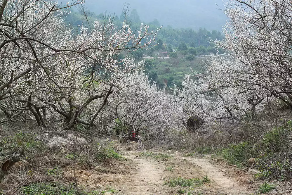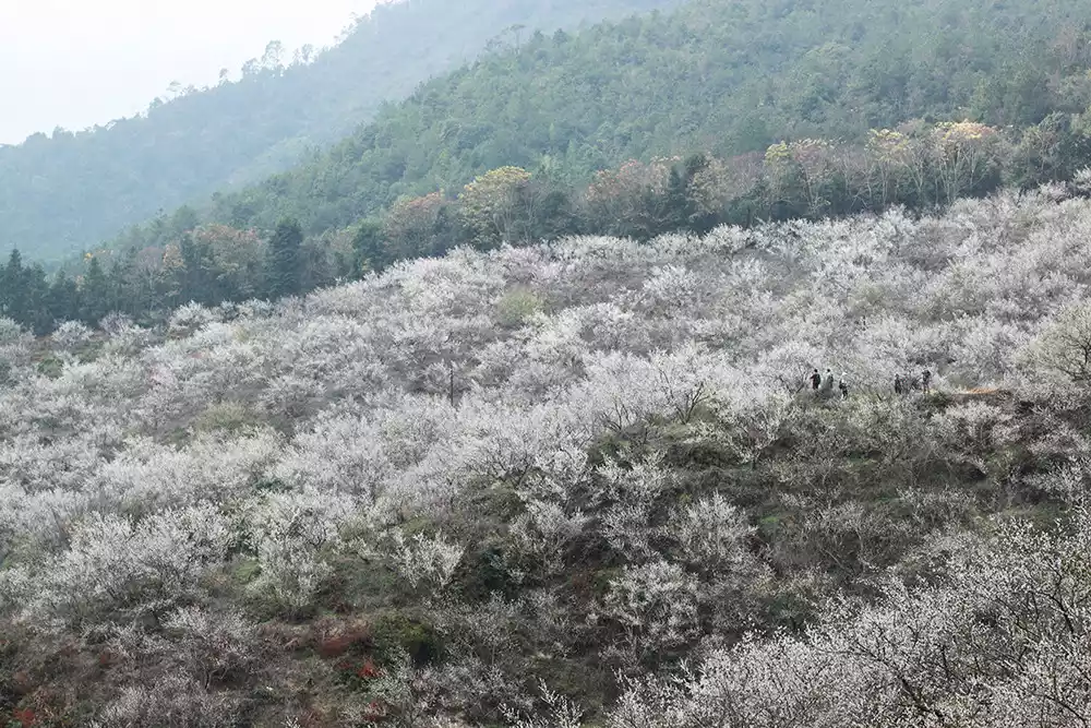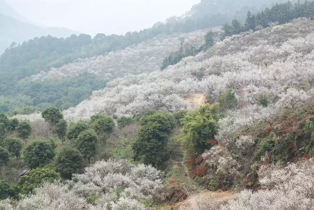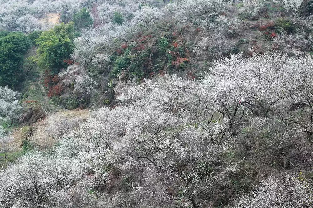 There are clusters of plum blossom trees along the mountain paths. Looking from across the mountains, they look like piles of snowflakes, which is a pleasant sight.
