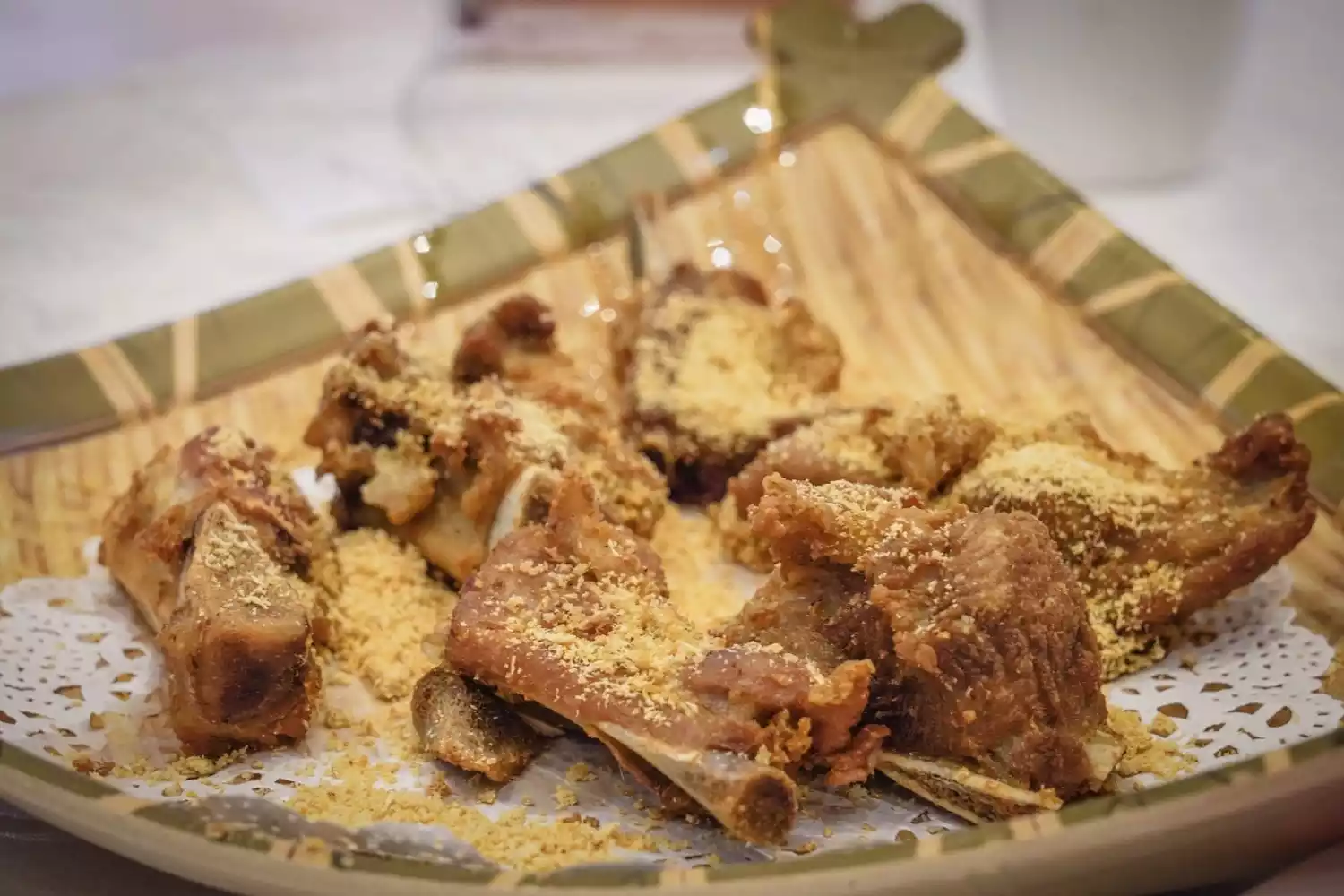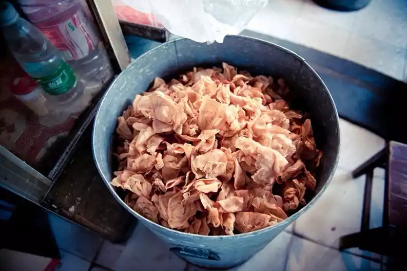 Ox ears are seasoned with butter and fermented bean curd and sliced as thin as paper, a feat that requires decades of knife skills. Deep-fry at 180°C for 4 minutes, until golden brown.