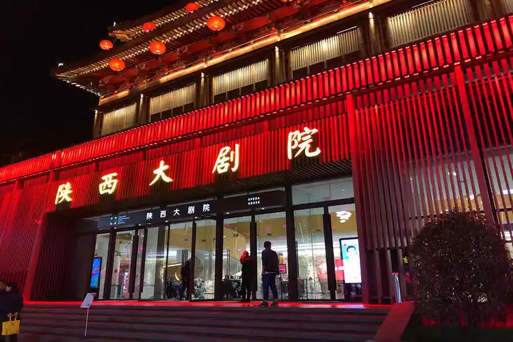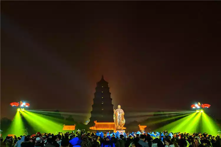 As night falls, we arrive at Xuanzang Square and Zhenguan Square, where we can witness the sculptures of Tang Dynasty heroes and experience the rich cultural atmosphere of Tang Buddhism. Looking back, we see the dazzling Shaanxi Grand Theatre and Xi'an Concert Hall, each resembling a palace of ancient charm.