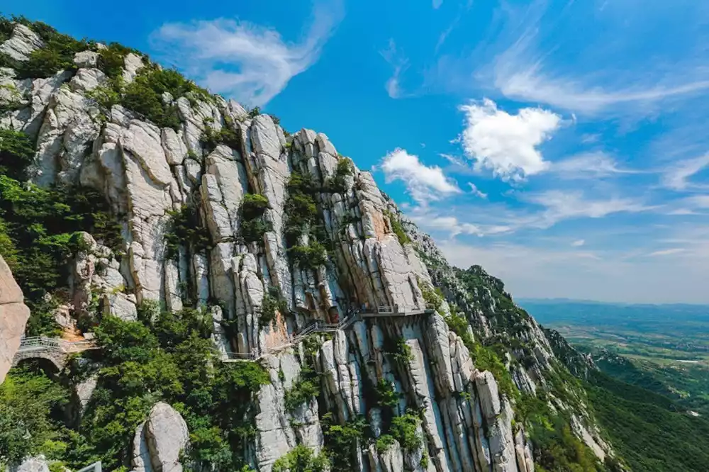 "I know from afar that my brothers are climbing the mountain, but among them there is one less person wearing dogwood branches." These are the lines Wang Wei wrote over 1,300 years ago while admiring Zhuyu Peak in Yuntaishan. Zhuyu Peak, at 1,308 meters, resembles an upside-down cauldron and boasts a glass-fronted plank road, perfect for adrenaline-seeking tourists.