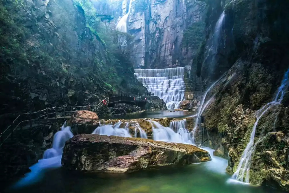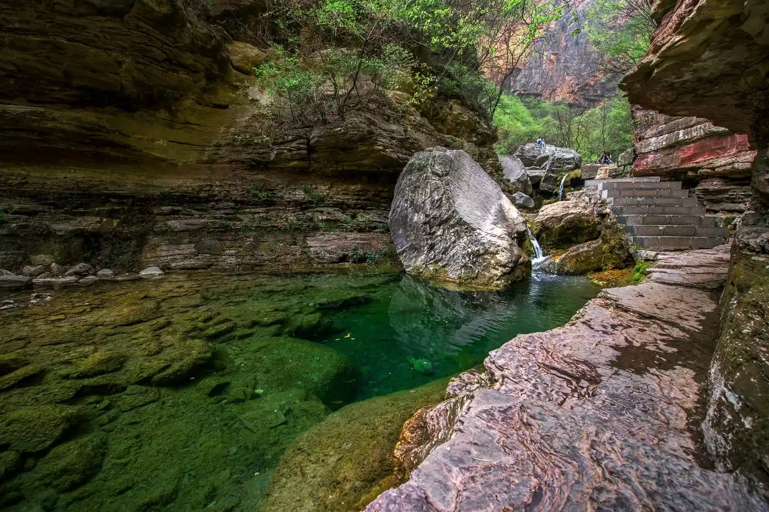 The rock walls are all red, so it is called "Red Stone Gorge", also known as "the first scene in Central Plains". The scenic area is beautiful, secluded, majestic and dangerous. There are springs, waterfalls, streams and pools in one valley. The temperature is 25 degrees all year round, making it a good place to escape the summer heat.