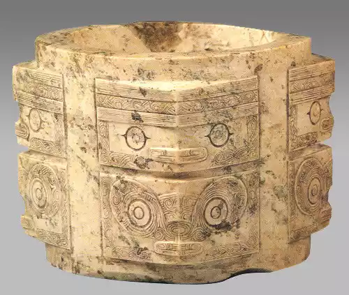 A ritual treasure: a jade cong with a combination of human and animal faces