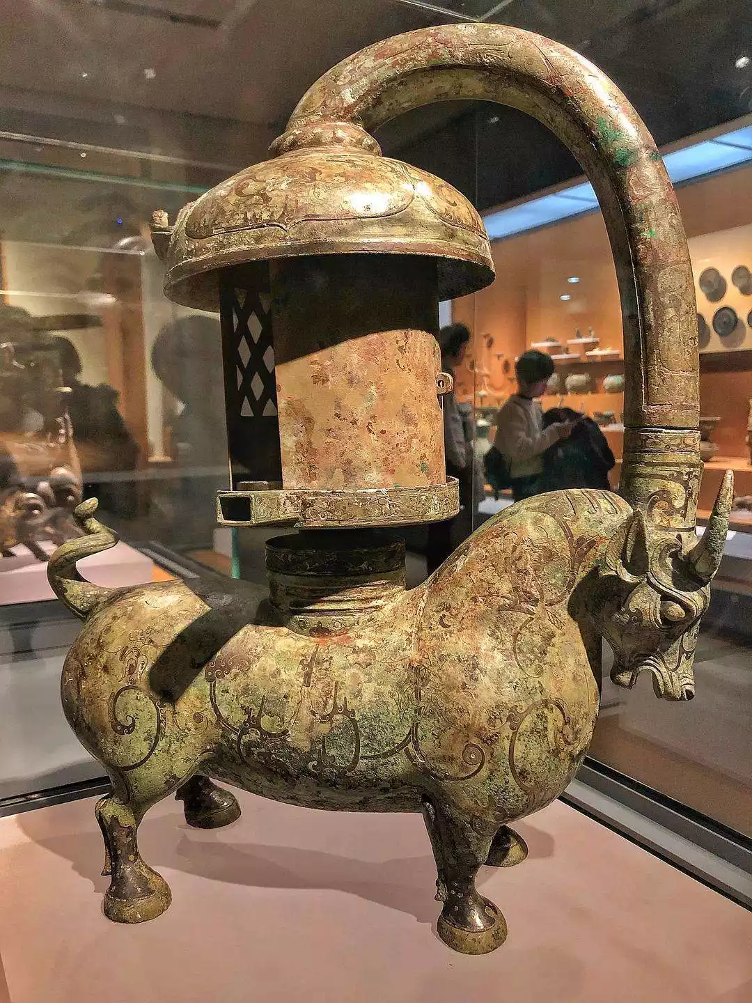 Unearthed in 1970 from a Han Dynasty tomb at Tushan, Xuzhou, the tomb occupies the Prince of Pengcheng during the Eastern Han Dynasty. The bronze inkstone in a box measures 25 cm long, 14.8 cm wide, and 10.2 cm tall. Gilded throughout, it is inlaid with red coral, lapis lazuli, and turquoise. The lid and body of the box are joined by a slit, forming a seamless, crouching mythical beast. Its head resembles a dragon, its triangular eyes staring wide open, its eyebrows raised, and its horns adorned. It lies prostrate, its jaw extended forward, ingeniously forming a reservoir for ink.