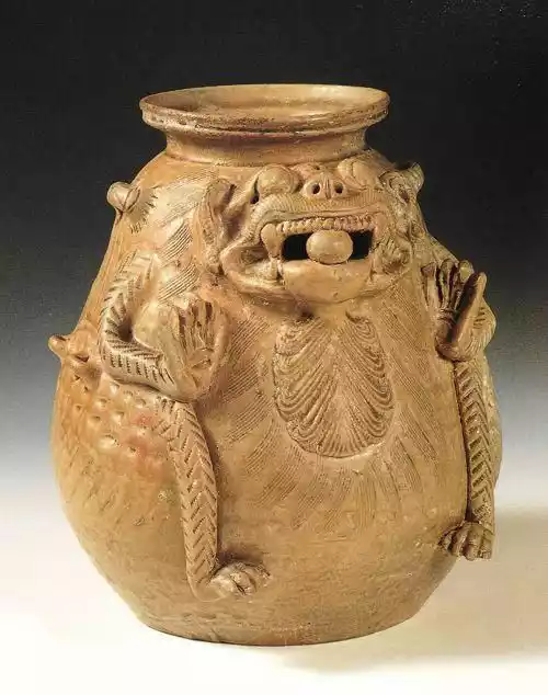 The shape of the mythical beast vase is slightly pear-shaped, with three horizontal ties on each side of the shoulders and abdomen, larger at the top and smaller at the bottom. The pieces are arranged in a Chinese character pattern, and the flat base is slightly concave. This celadon mythical beast vase is large in size, with a striking demeanor and richly engraved patterns throughout. Its unique form, typical of Western Jin porcelain, makes it extremely valuable.