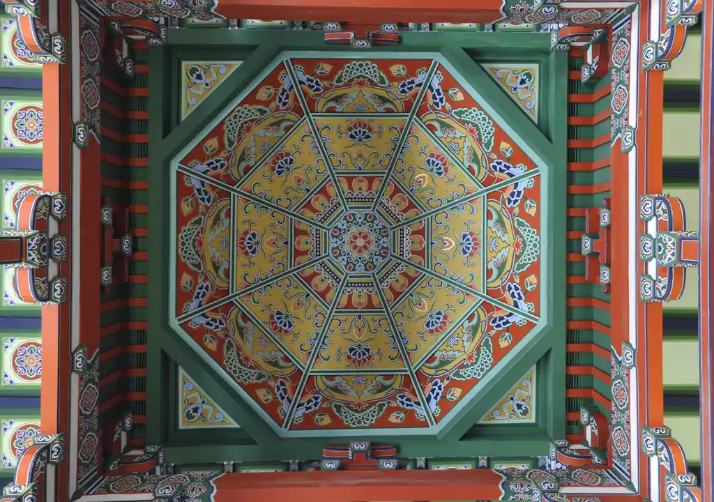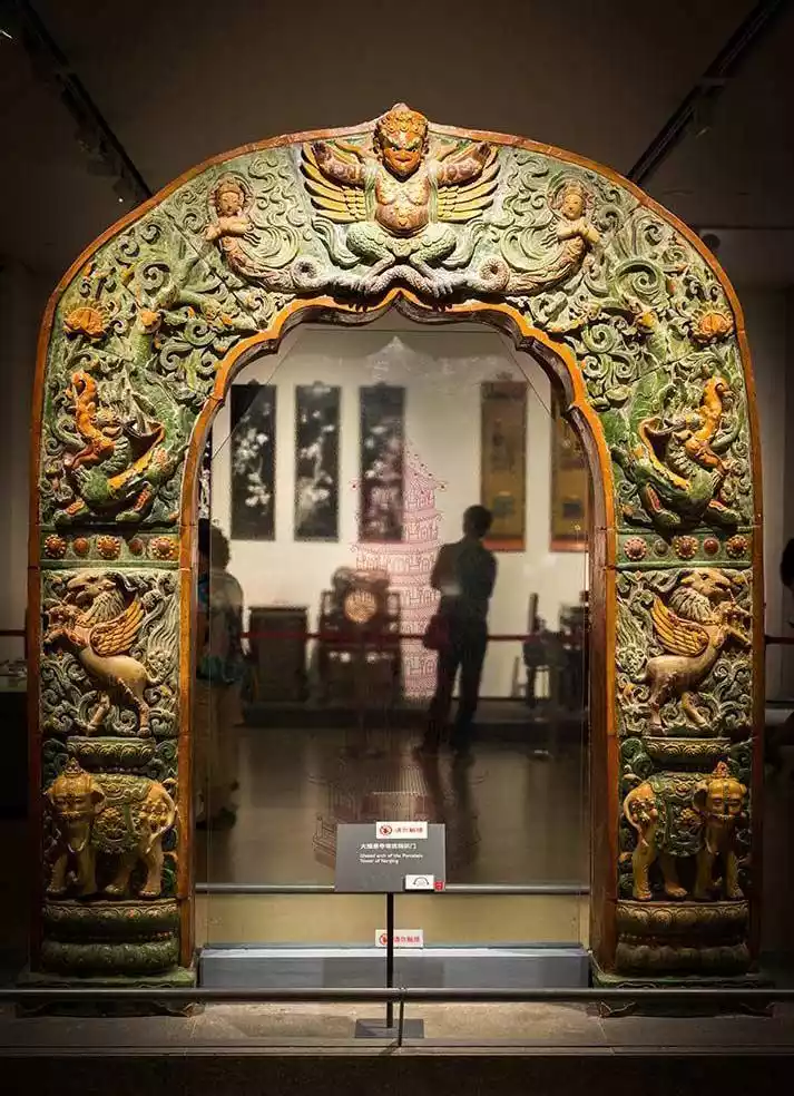 Selected as one of the three national treasures in the collection of Nanjing Museum, this archway was restored using a spare set of structures from the Ming Dynasty Da Baoen Temple's glazed pagoda. The image on the door ticket is a Dharma decoration (six-handled objects) unique to Tibetan Tantric Buddhism. The top of the door holds a majestic Garuda, and statues of gods and mythical beasts such as the Dragon Girl, Capricorn Fish, Lion-Sheep Beast, and White Elephant King are symmetrically arranged on both sides.