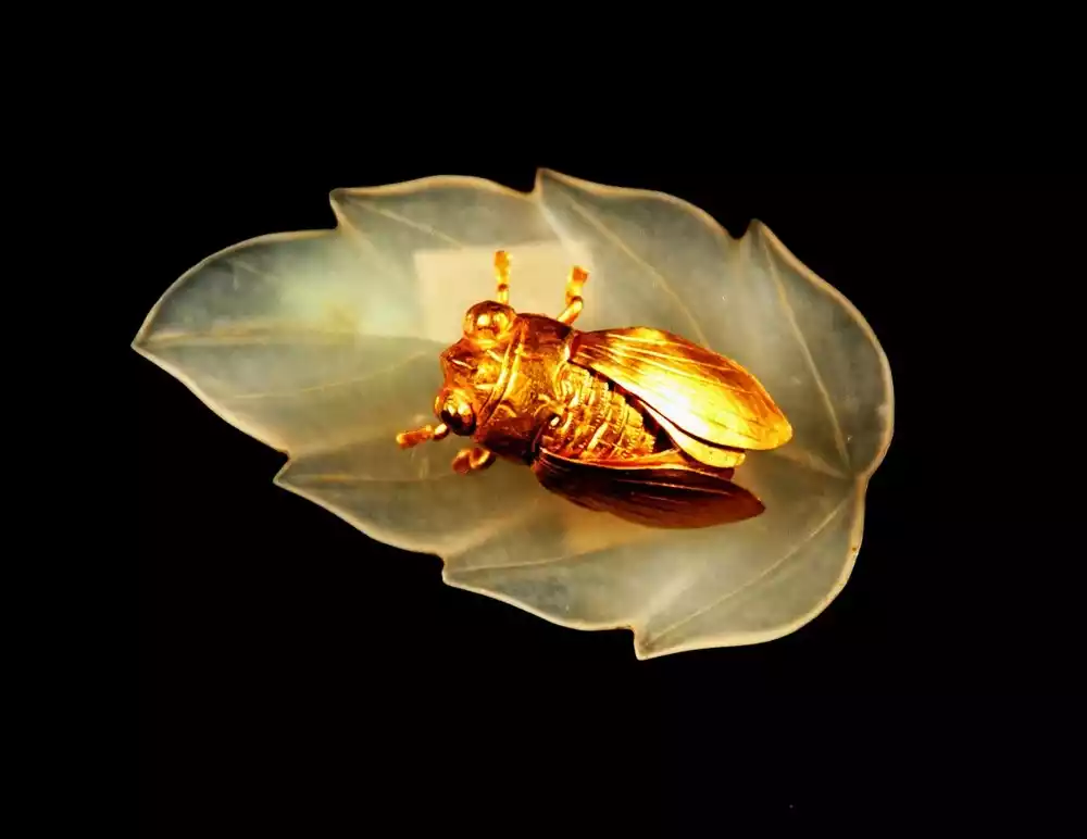 The cicada was a common artistic motif in ancient China, often used as burial objects. Ancient Chinese believed that after death, humans could emerge from their cocoons and be reborn, just as the cicada did. The "Golden Cicada and Jade Leaf" weaving technique from the Ming Dynasty utilizes a unique conception, depicting a lifelike golden cicada perched leisurely on a flawless white jade leaf, creating a dazzling display of golden light and a captivating effect.