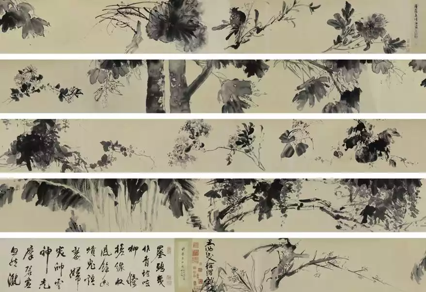 The entire scroll is 30 cm long and 1053.5 cm wide. In this more than ten-meter-long scroll, Xu Wei used vivid "glue and ink" to paint 13 kinds of flowers, vegetables and fruits, including peony, pomegranate, lotus, sycamore, chrysanthemum, pumpkin, lentil, crape myrtle, wisteria, banana, plum, orchid, bamboo, etc., starting with peony.