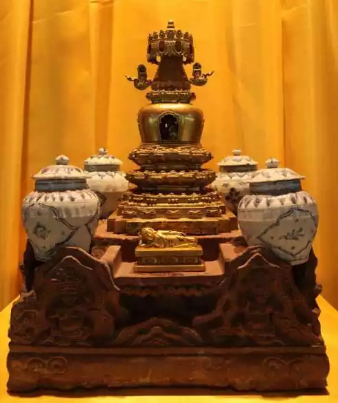 The gilded Lamaist pagoda has four doors, housing statues of Sakyamuni and Skanda, adorned with a wheel of Dharma, thirteen deities, a canopy, and precious beads. Inside, a group of Buddha statues rest on a Sumeru pedestal, which contains pearls, gemstones, crystals, agates, jade, and ashes. Animal-horn Buddha statues, porcelain jars, and jade bottles have also been discovered around the pagoda.